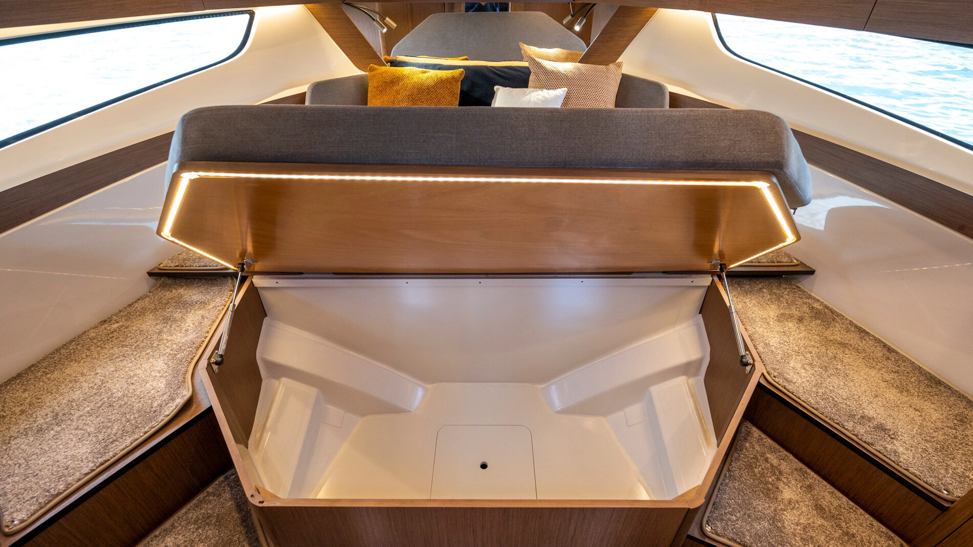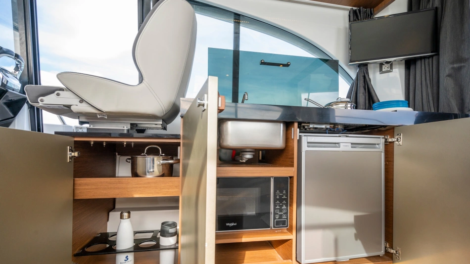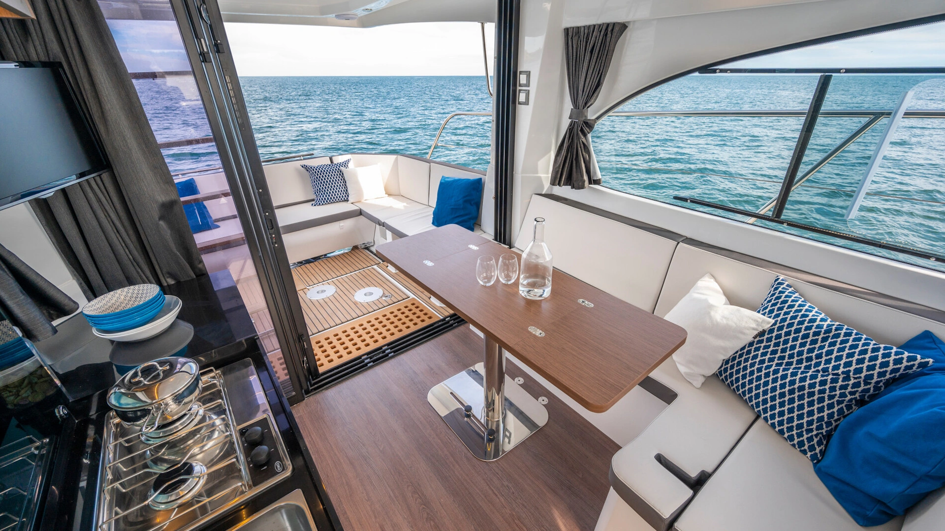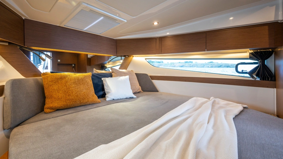 The aft cabin is full beam and has three berths. The Antares 11 has a convertible saloon and can accommodate up to 7 people in excellent conditions.