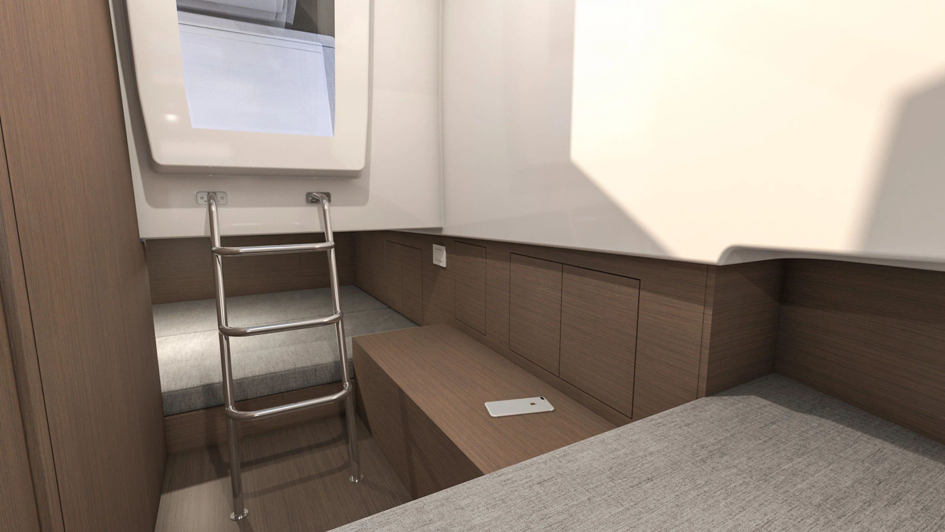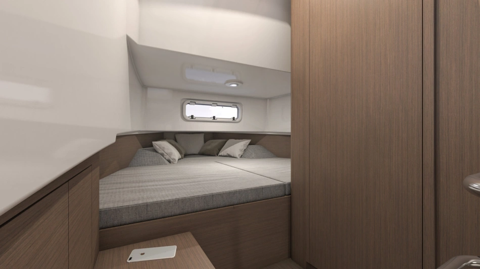 The cabin reserves its share of unexpected comfort features on an open hull. The interior space is surprisingly large and includes two berths, and a head.