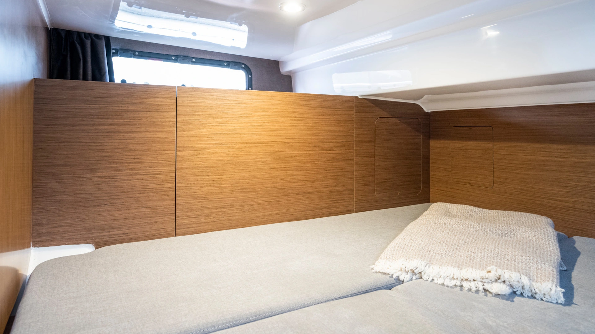 While the Flyer 9 SUNdeck can accommodate in its cockpit, it also features a comfortable cabin, which is particularly large and has two large double berths. The bathroom proves surprisingly large with a separate shower.