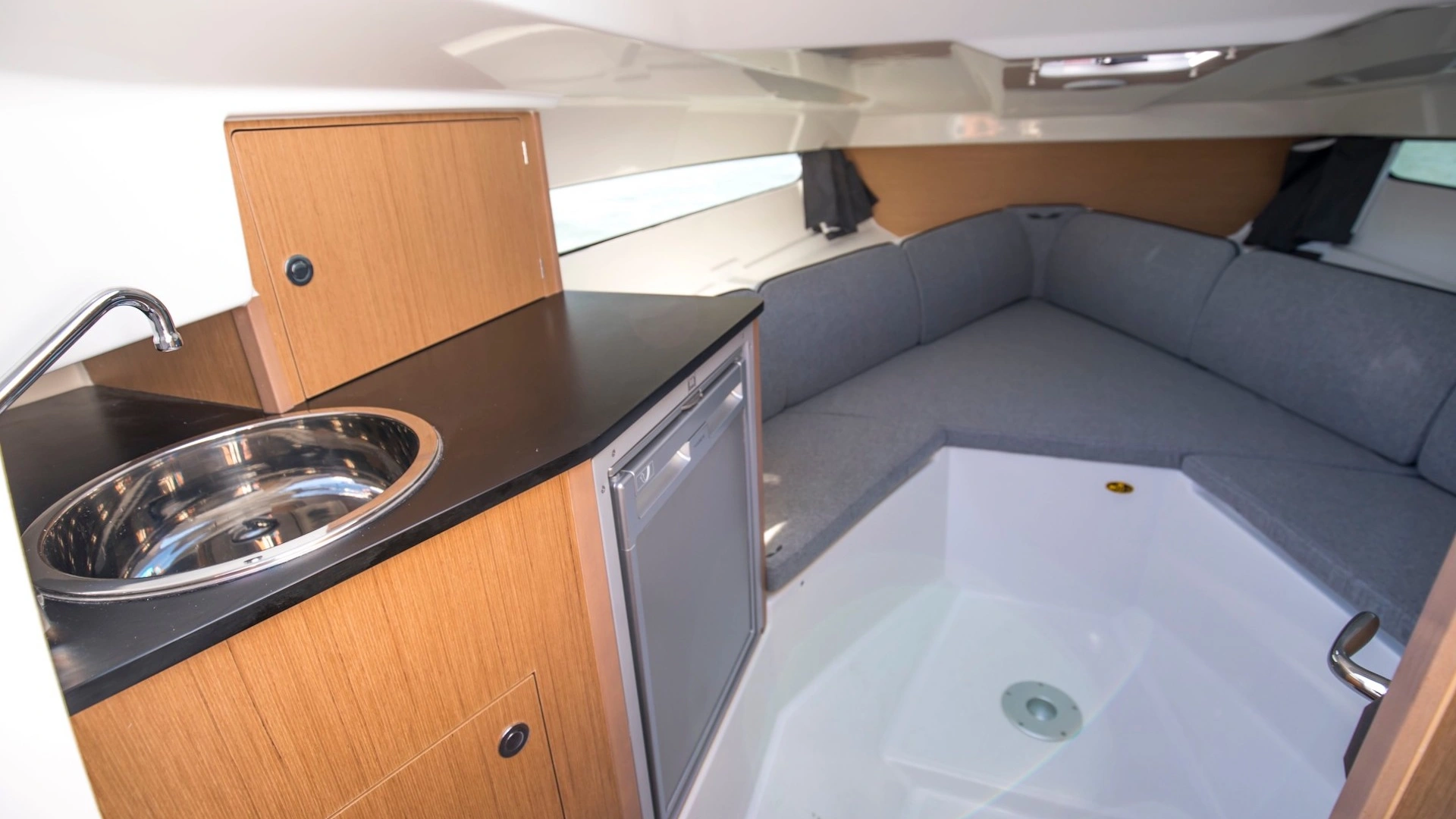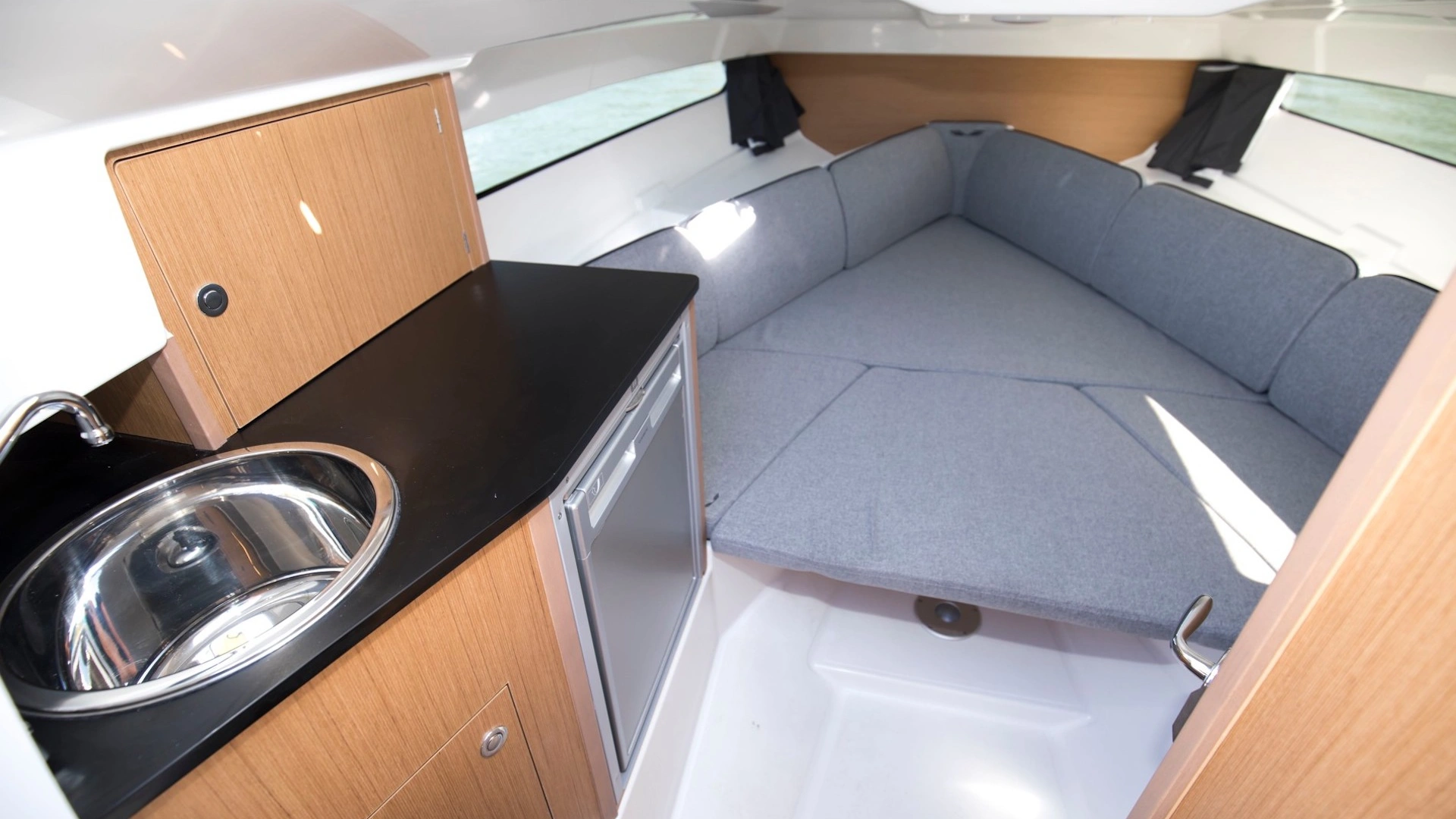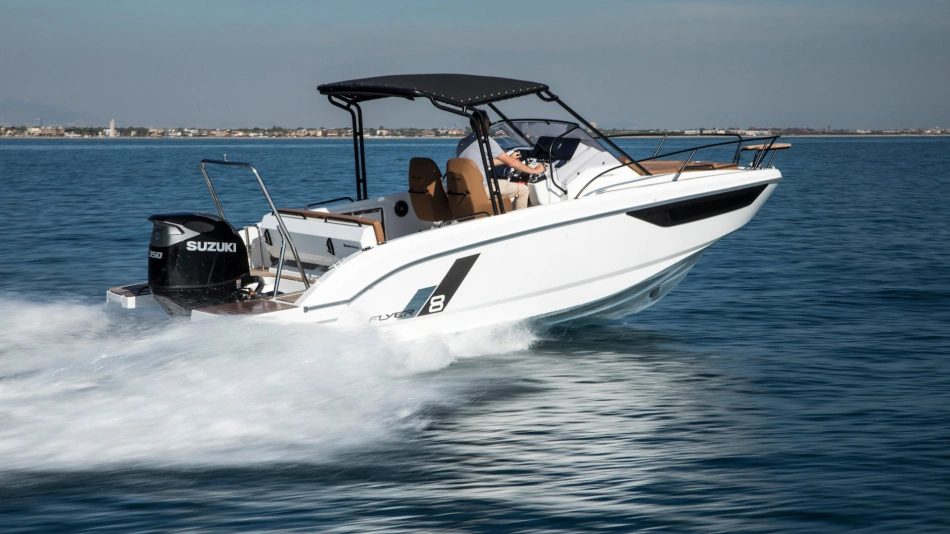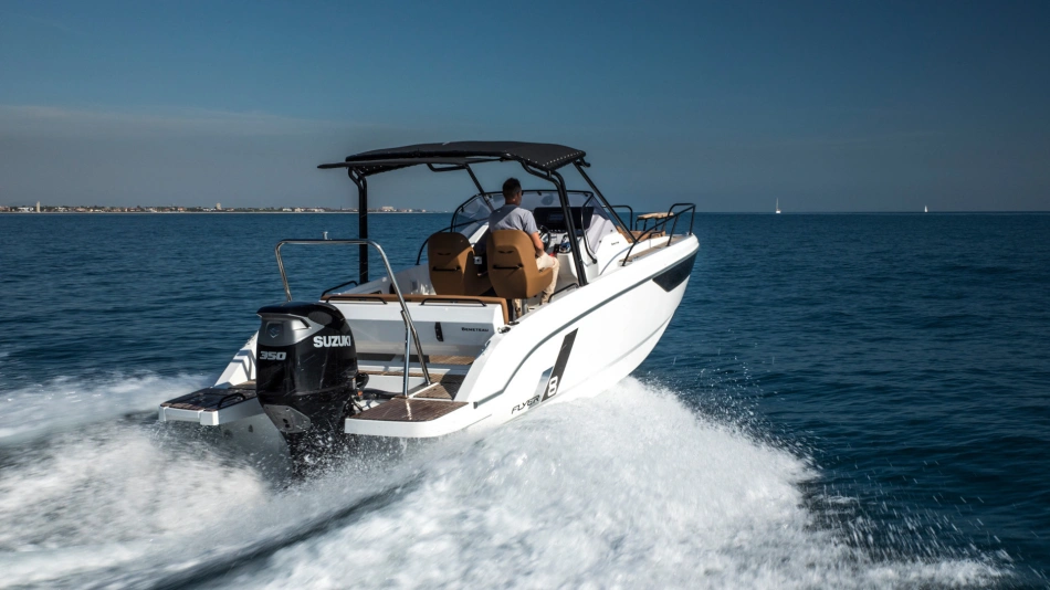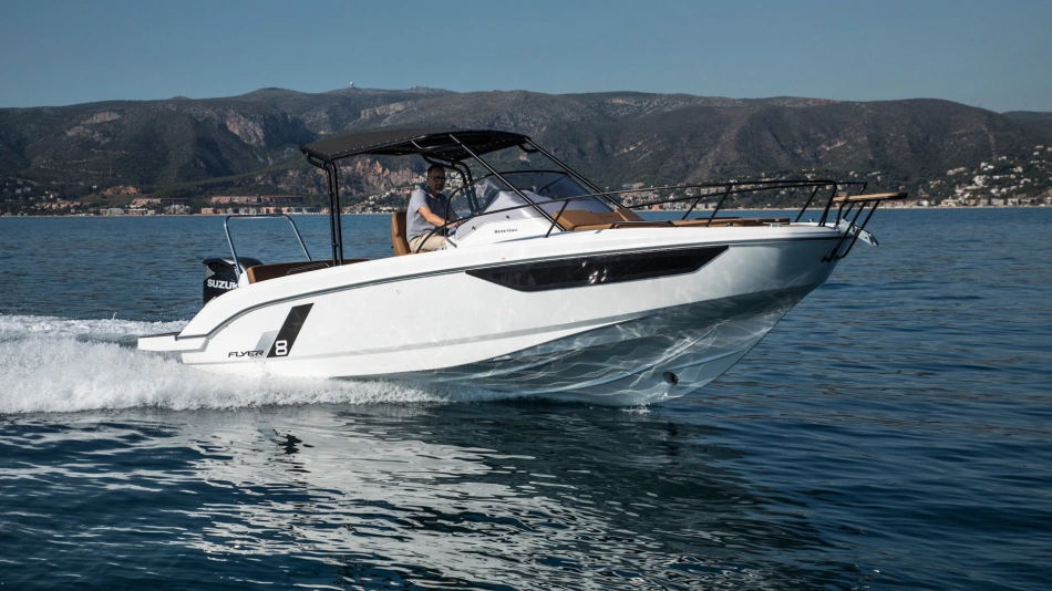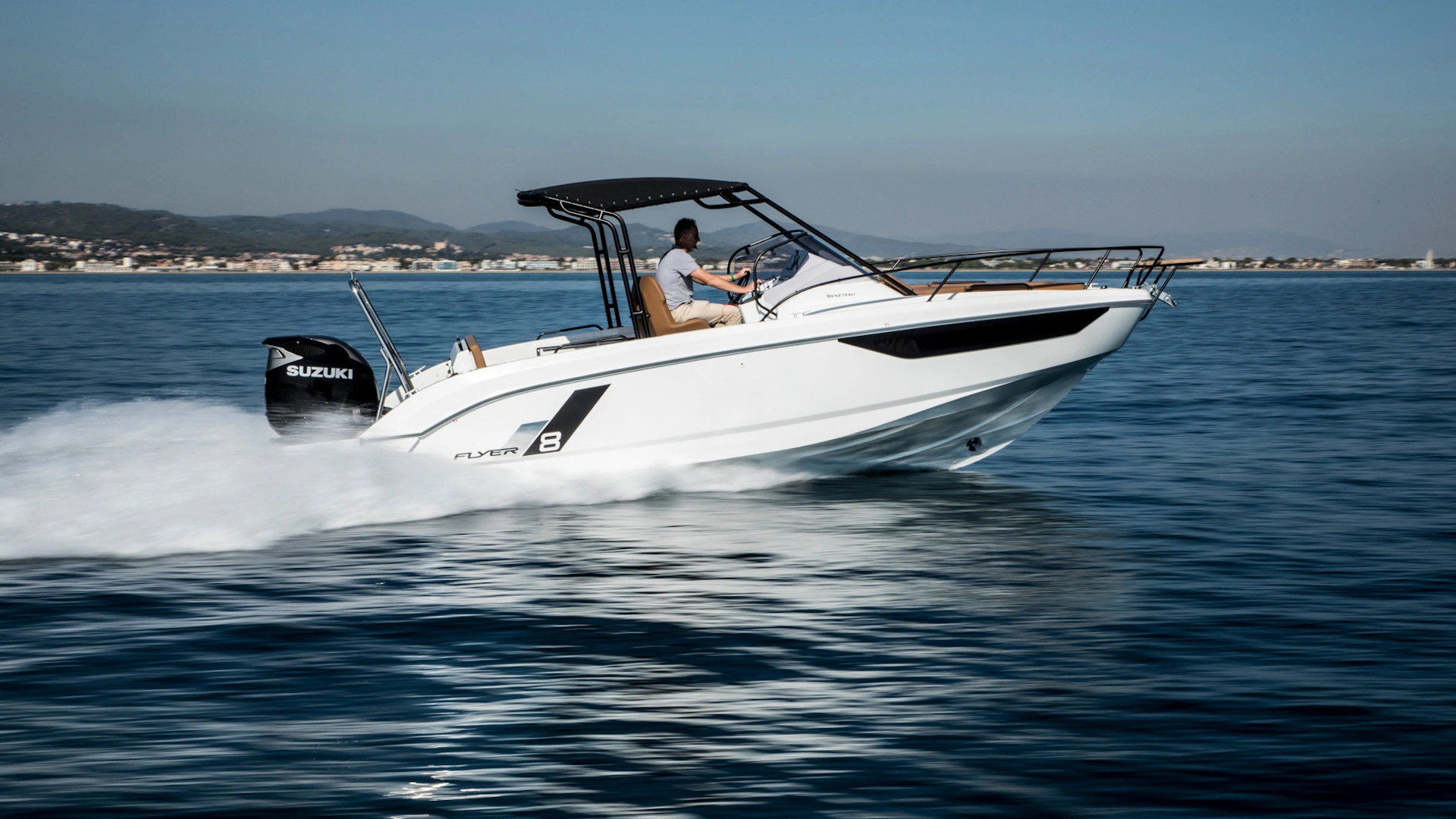 The Flyer 8 SUNdeck exceeds regular day boat standards by combining comfort, generous space and sensations. Its highly optimized design makes it the ideal boat for a weekend getaway. A decent-sized cabin lies beneath a large sunbathing area for lazing in the sun.