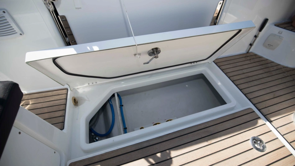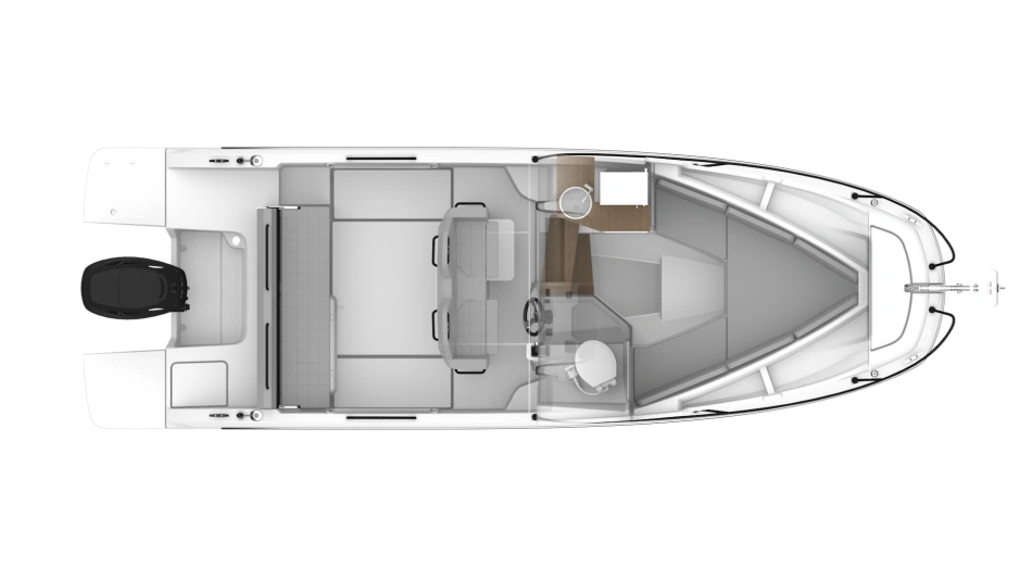 The Flyer 8 SUNdeck has the aesthetics of a modern classic, with taut yet attractive lines, complete with black pulpits. Developed on the latest generation of outboard hulls equipped with Air Step 2, the boat lifts off quickly and offers outstanding cruising comfort. The aft bench seat is easy to fold back, providing optimum cockpit space. There are also lots of ergonomic storage spaces spread throughout the boat.