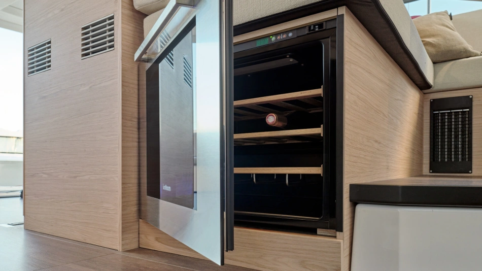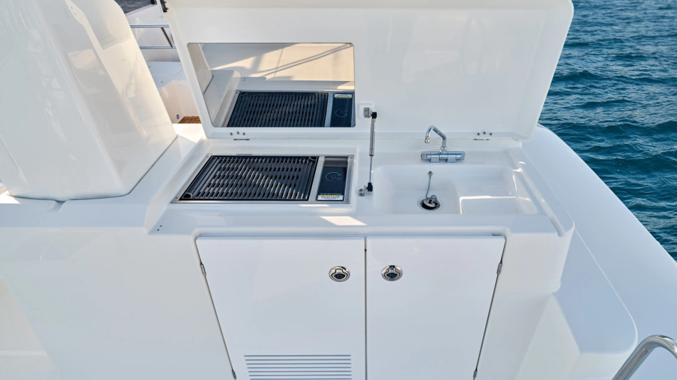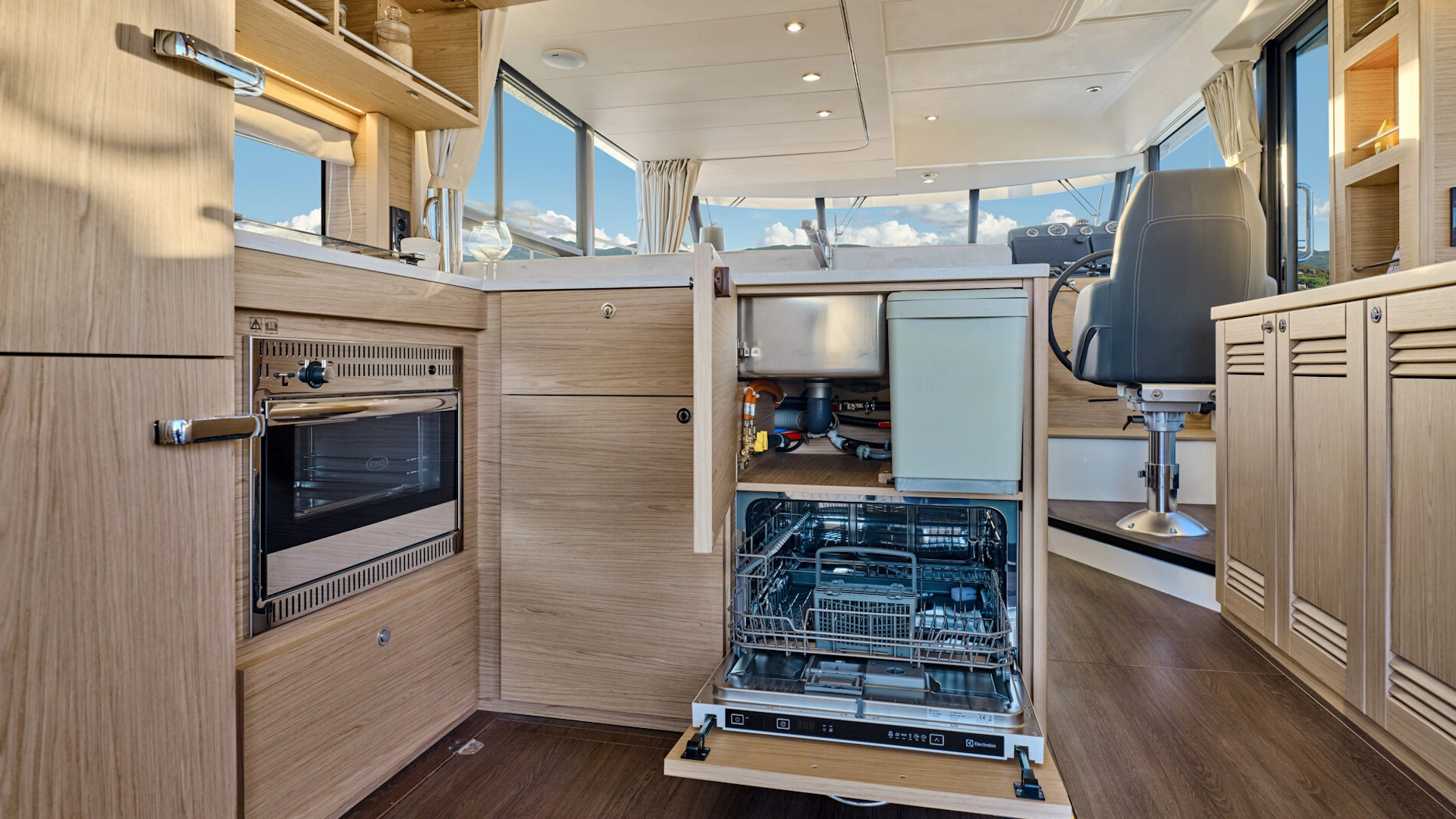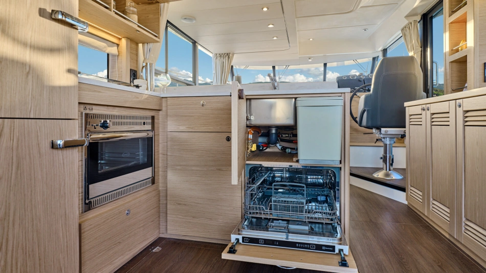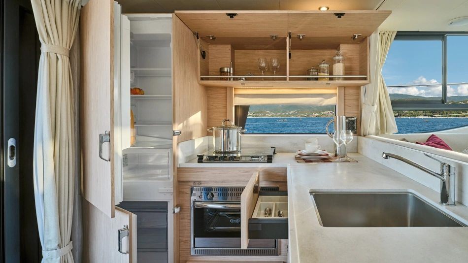 A large fully-equipped L-shaped galley offers plentiful capacity for extended cruising.