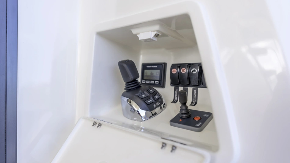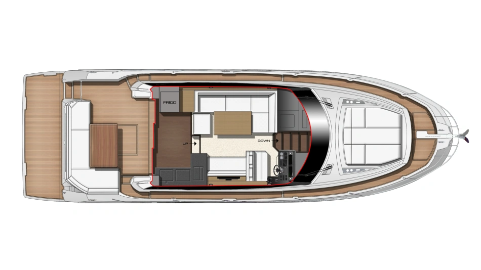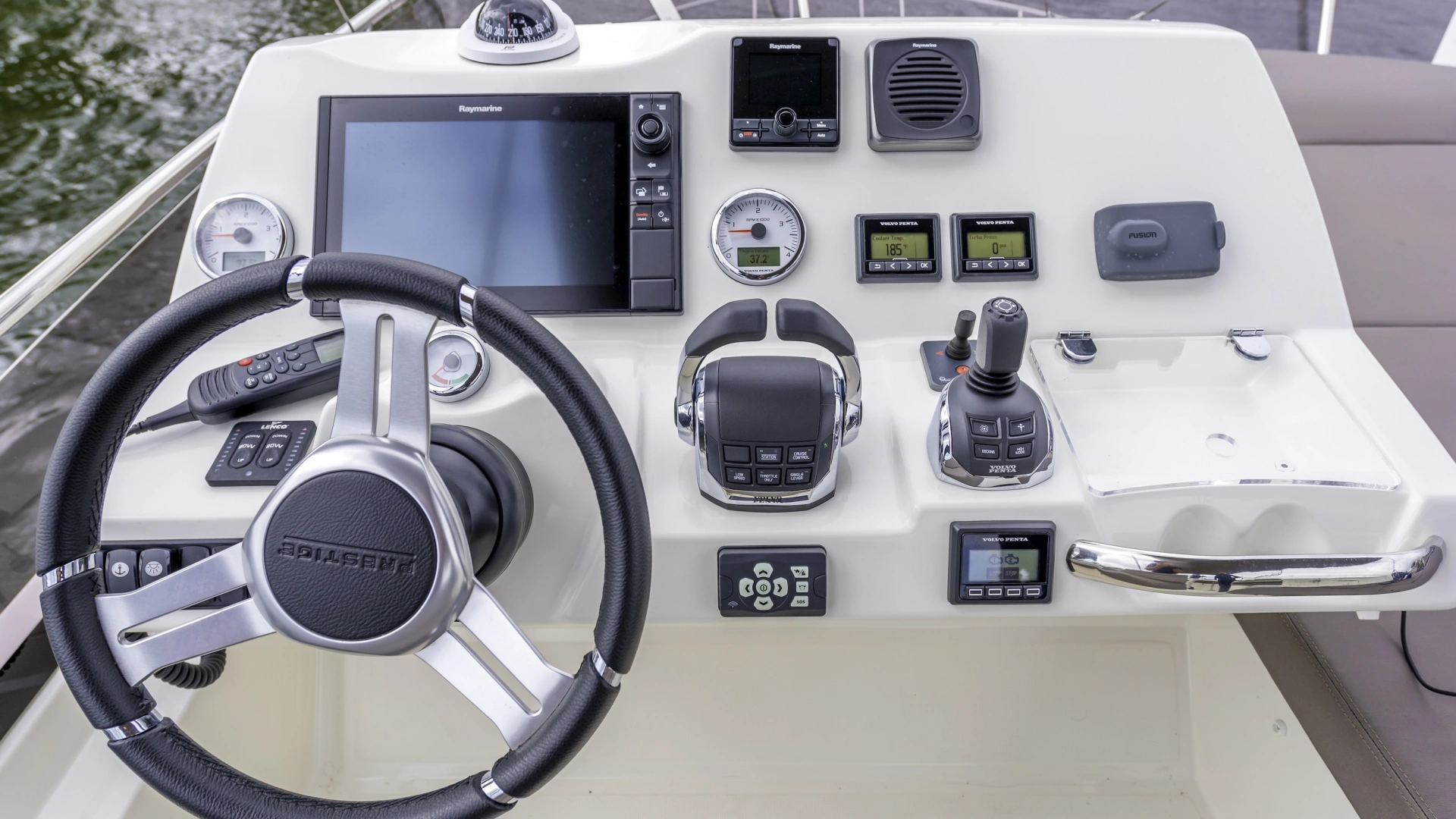 This Flybridge integrates the concept of the L-shaped cockpit, which allows for maximum use of space.