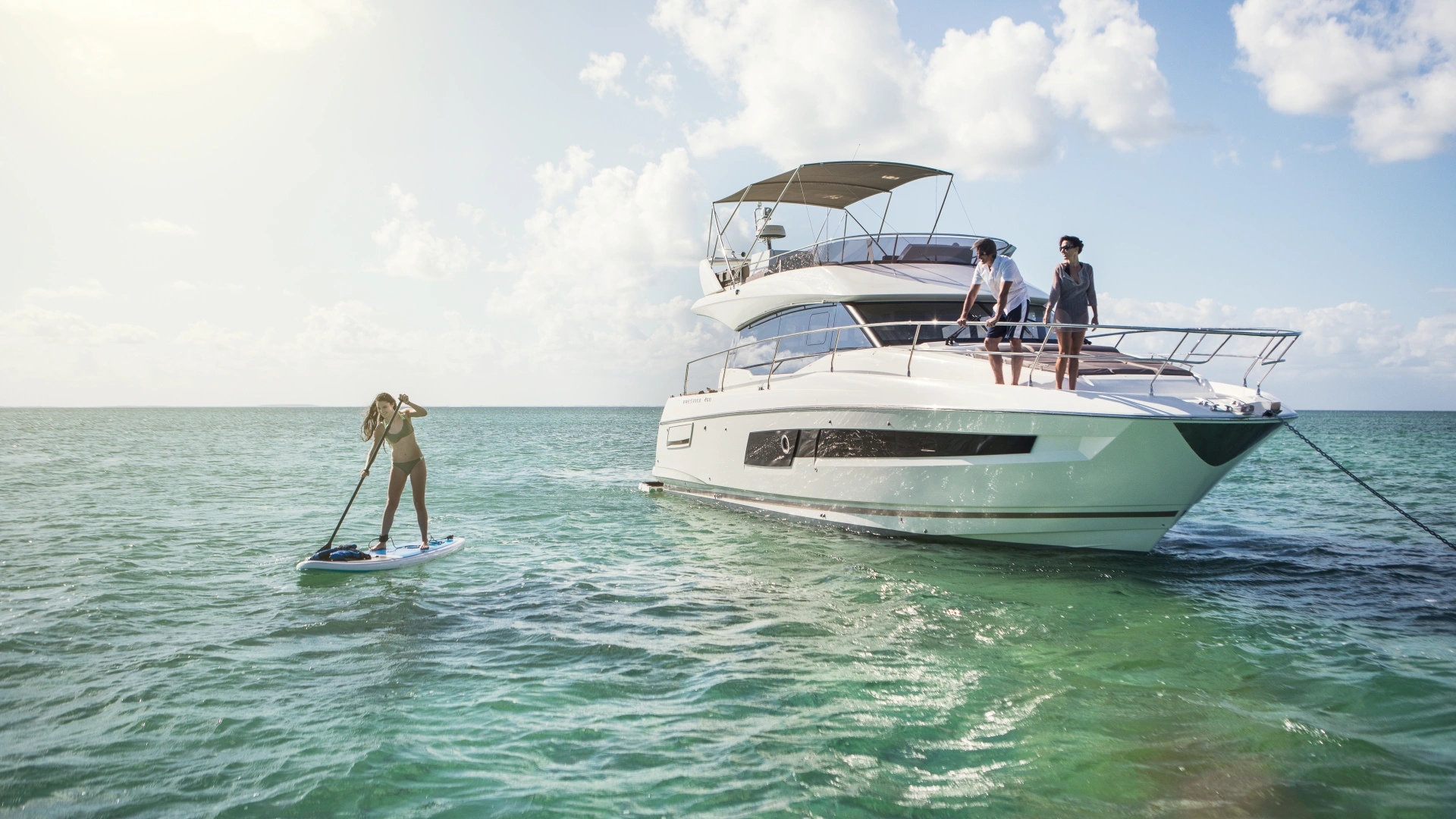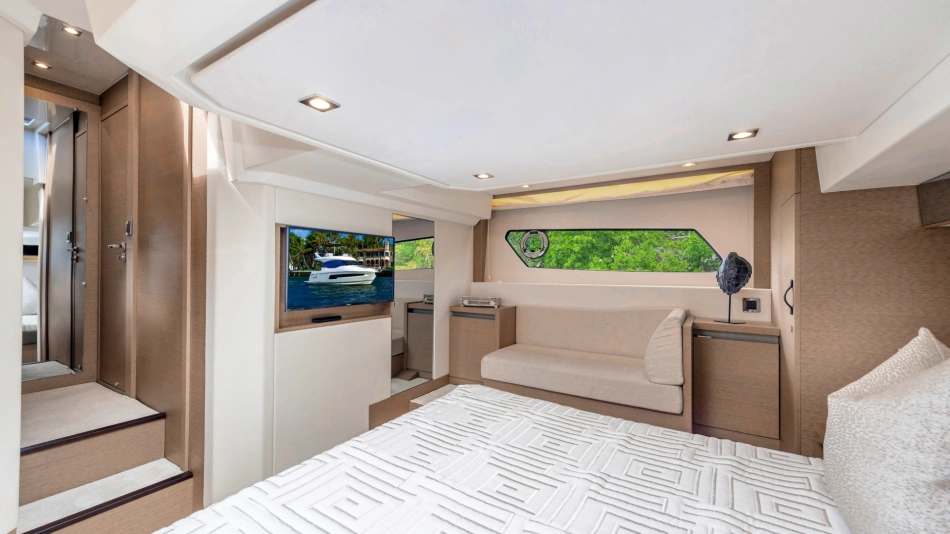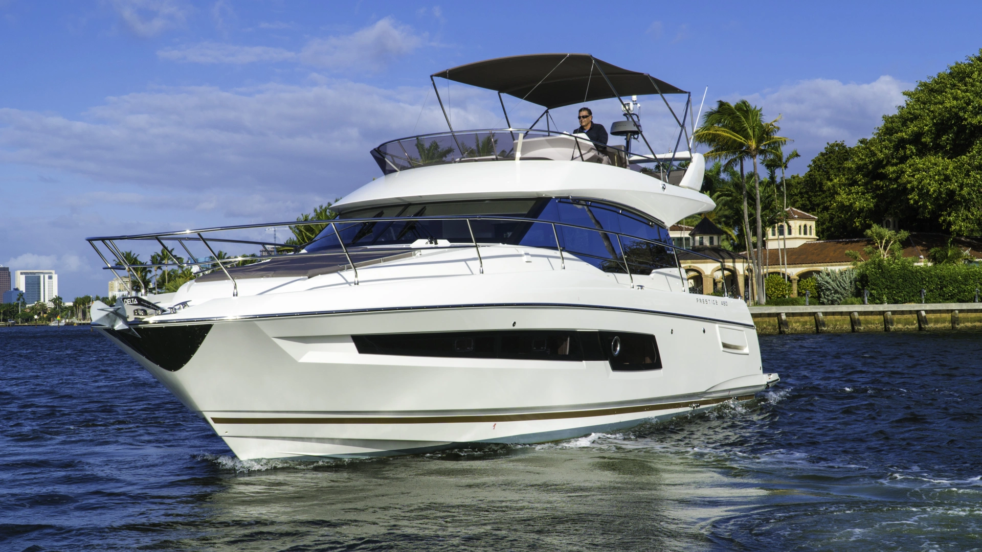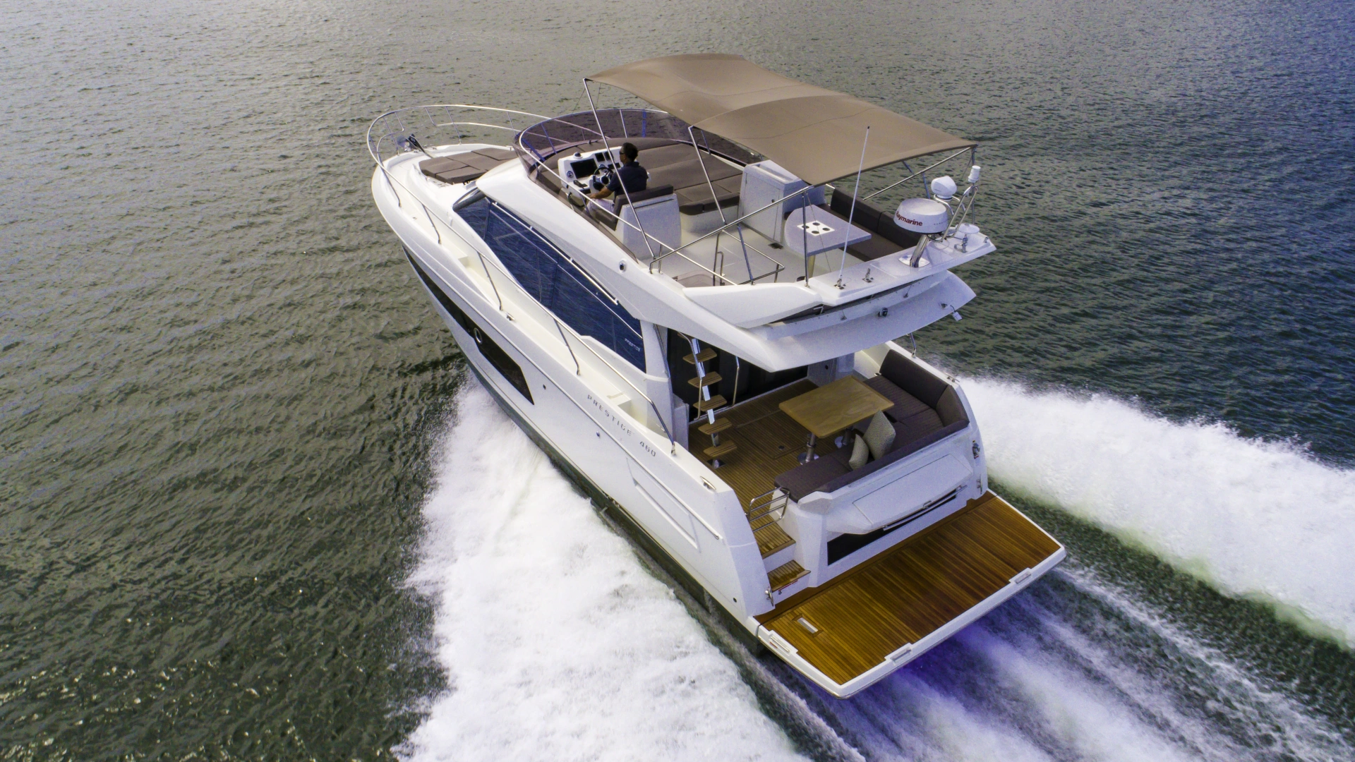 On the exterior, she features the signature style of the latest PRESTIGE Yachts, with an expanded, continuous line of windows in the hull.