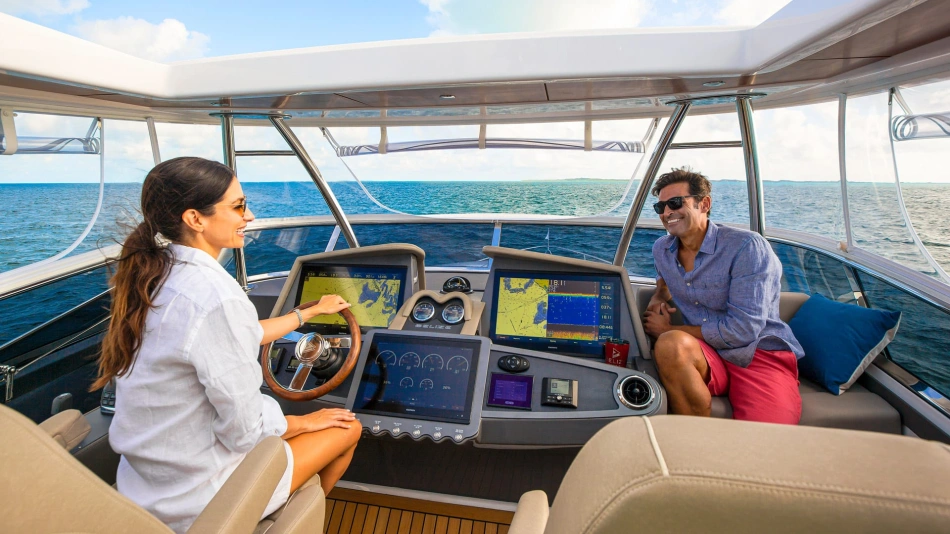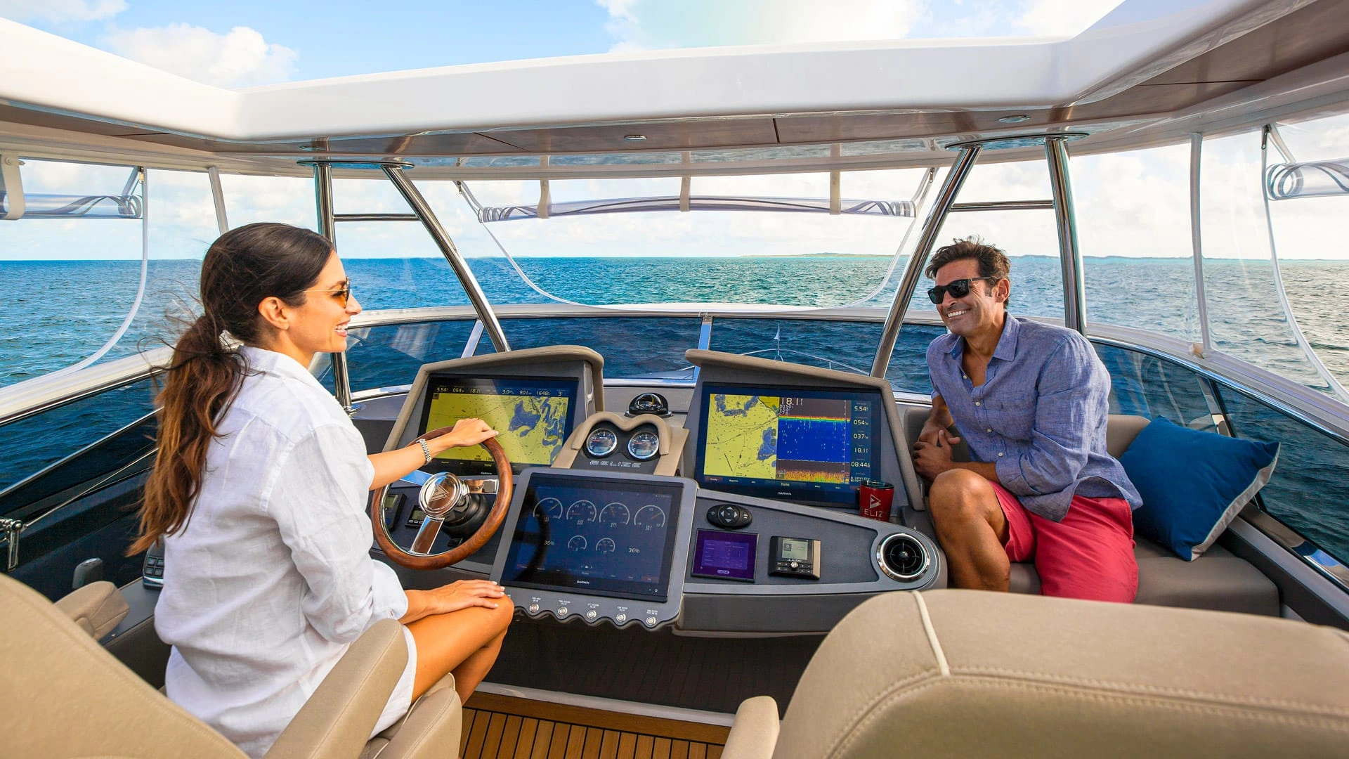 Discover the skipper’s helm forward. The lower helm and expansive helm in the Daybridge both feature state-of-the-art navigation aids, simple touchscreen operation and effortless joystick control. Volvo Penta Inboard Performance System (IPS) delivers exhilarating performance and impressive economy.