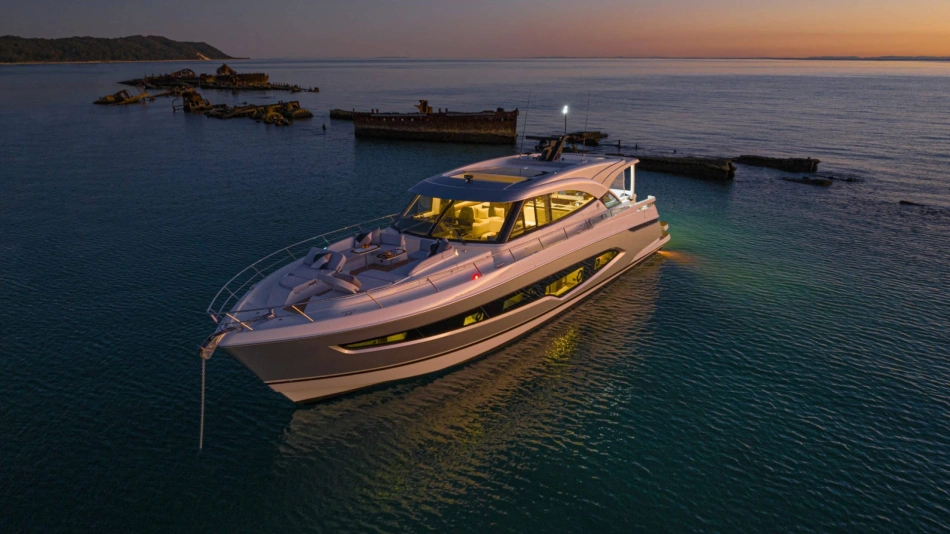 Perfect for a long-range adventure or a weekend away; with a choice of 3 or 4 staterooms and three bathrooms, a crew cabin or utility laundry, a full-height walk-through engine room and an impressive tender garage devoted to water sports.