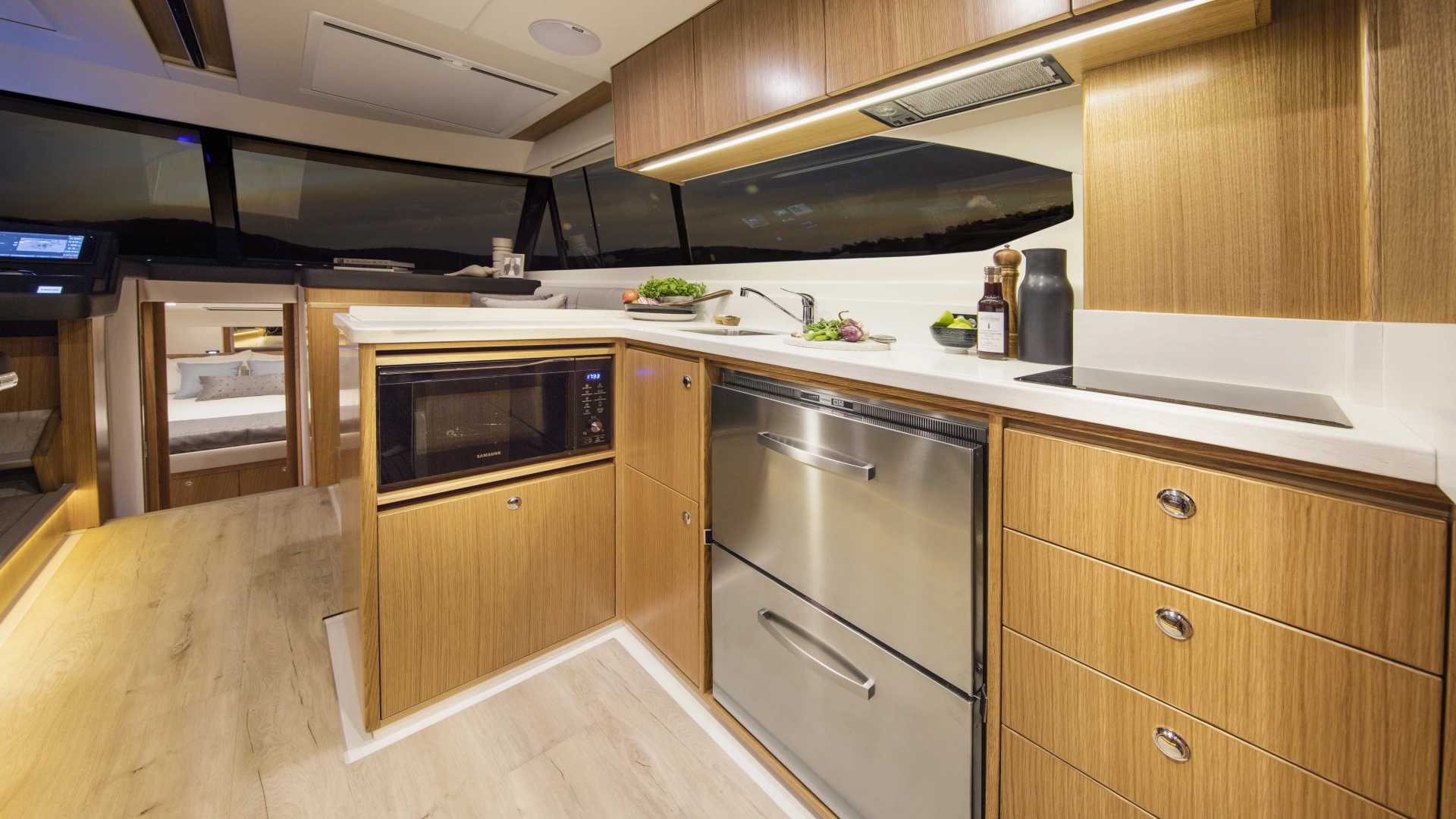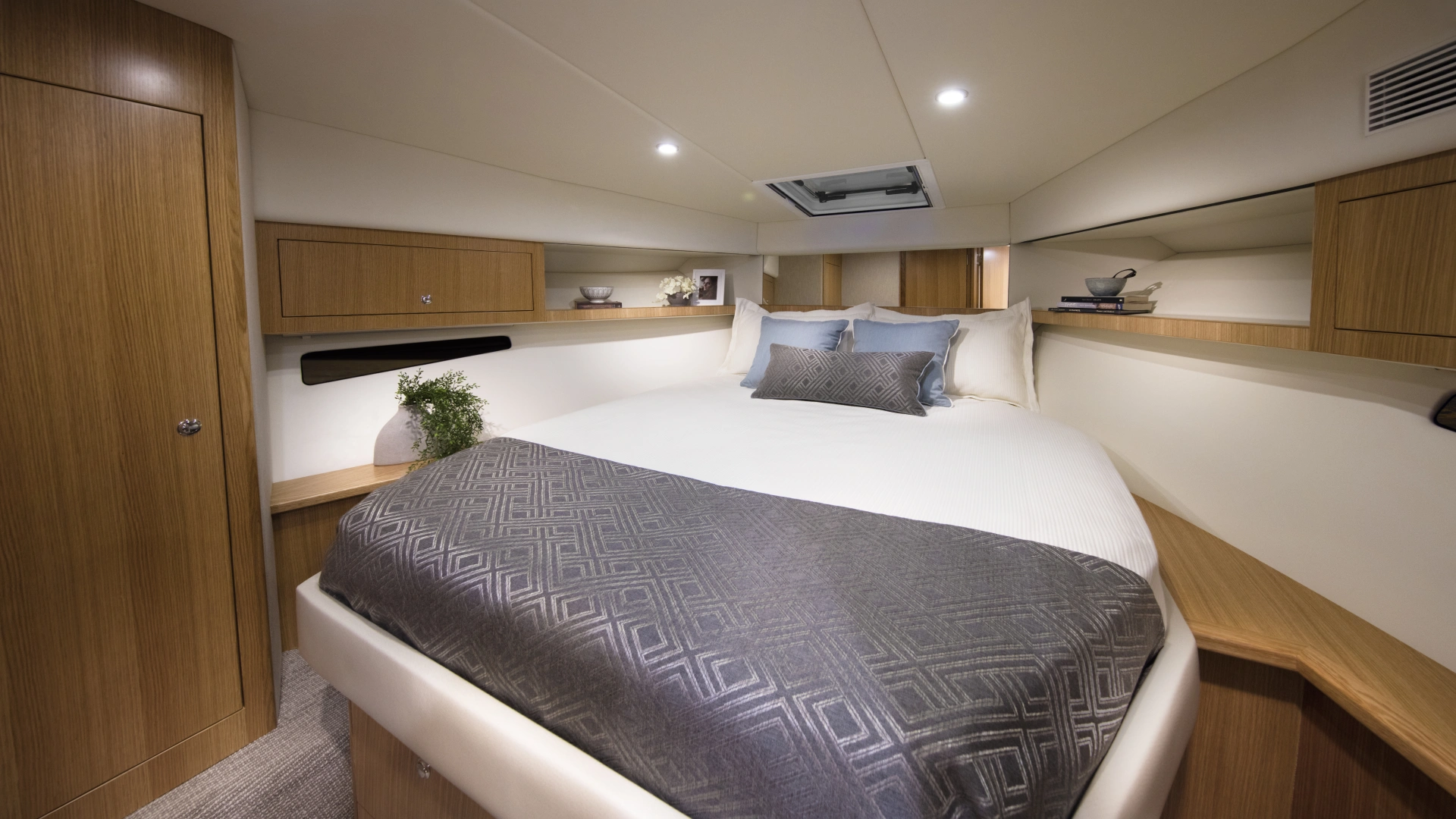 Discovering the accommodation deck you’ll quickly appreciate how Riviera design sense and flair makes so much possible. The master stateroom boasts a large walk-around queen-size bed, handcrafted storage and adjacent designer en-suite. Your guest stateroom accommodates up to three adults in signature Riviera style.