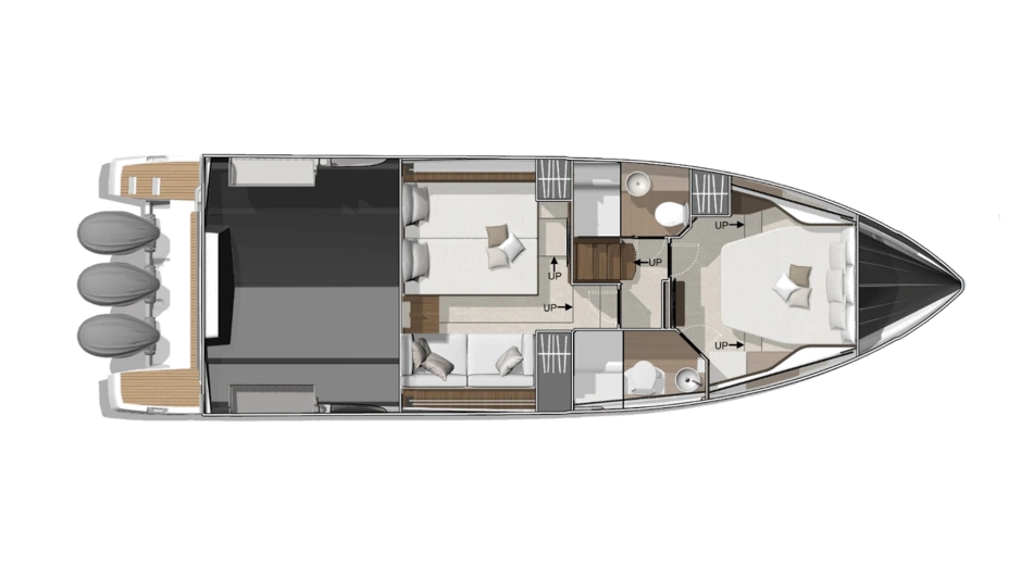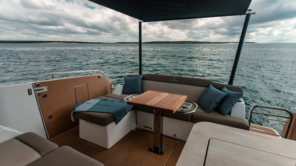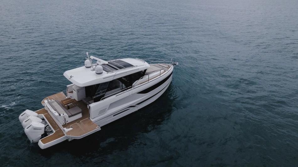 The Wellcraft 44 Explorer is designed to provide the ultimate in comfort and convenience. The high freeboard and starboard side door make life onboard easy and safe. The bow features two (2) large social areas with a generous triple sun lounger and seating designed for entertaining, while the aft provides two (2) comfortable lateral folding side terraces for a spacious open-air gathering area.