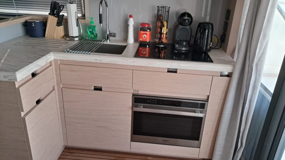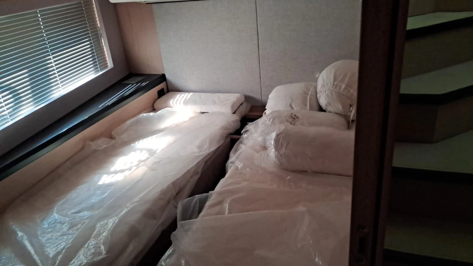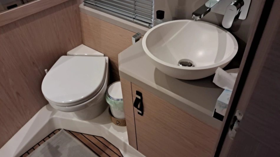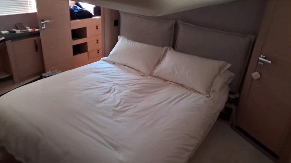 The very large saloon, like the newly reorganized spaces of the flybridge, the extensive owner suite, the three cabins and two shower rooms unfold to reveal a voluntarily minimalist décor of lightcoloured woodwork and linings, which is bang on trend.