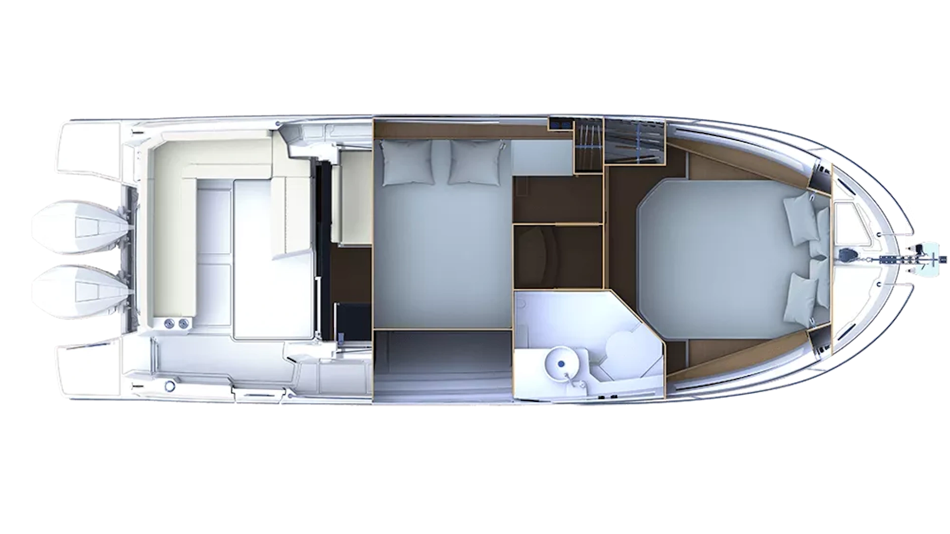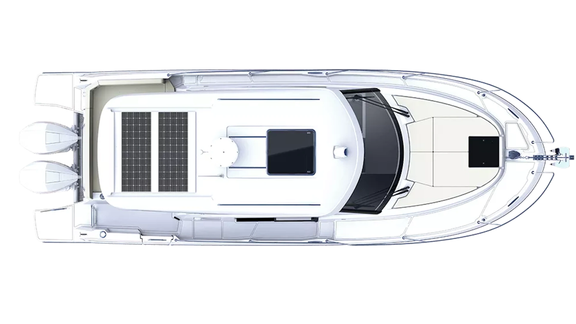 The new Antares 9 has an elegant profile and boasts sleek, powerful lines, enhanced by a silver rubbing strake and long hull windows. The wheelhouse arch, a real hallmark of the line, forms a slightly broken curve. It joins the extensive coachroof which protects the generously sized aft cockpit (1.7 m by 2.4 m). By adding an extra seat, the L-shaped bench seat can be converted into a U-shaped saloon area, the ideal layout for a large number of guests. This modular saloon can be easily converted into a sunbathing area when you want to relax and sunbathe.