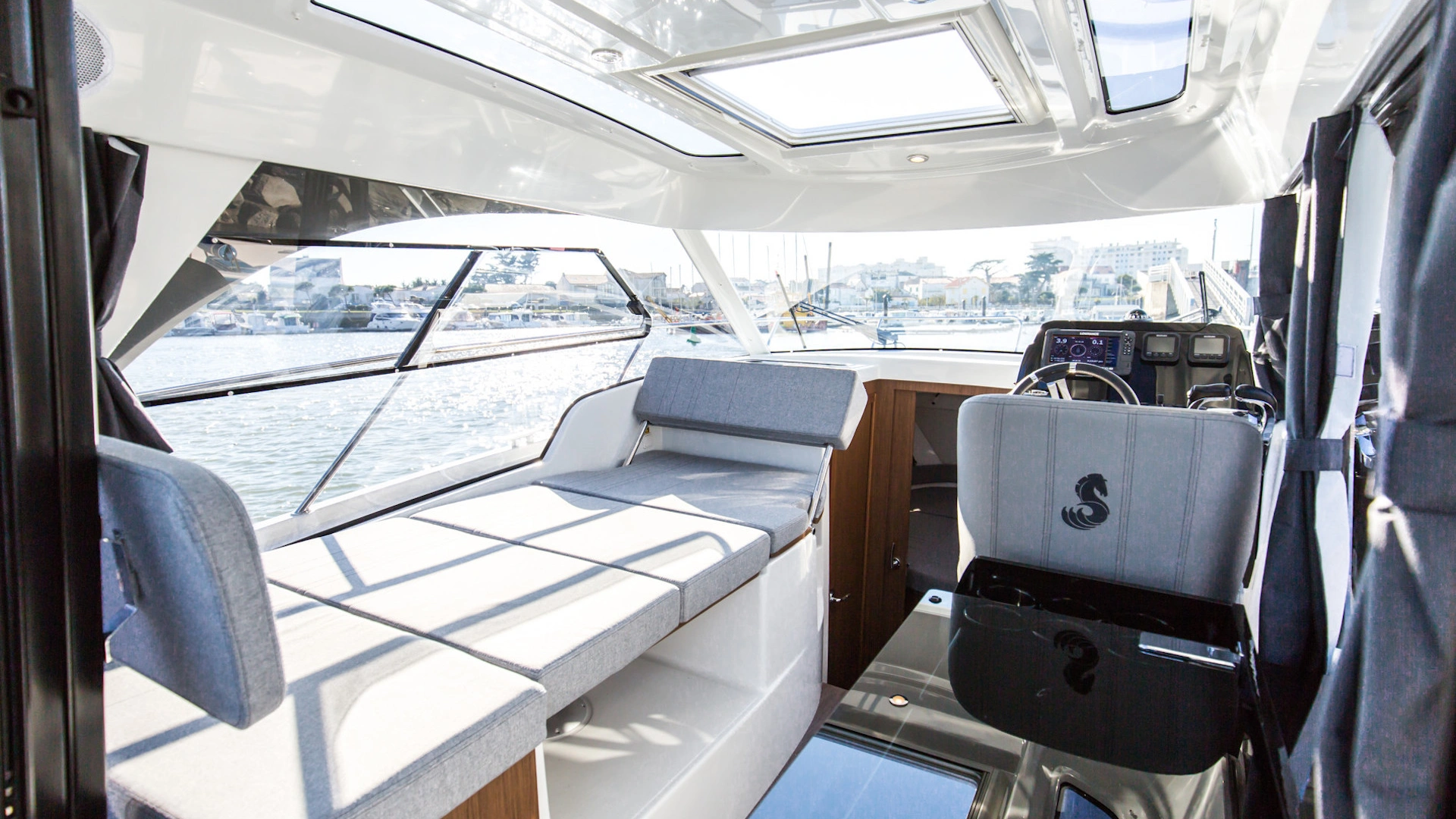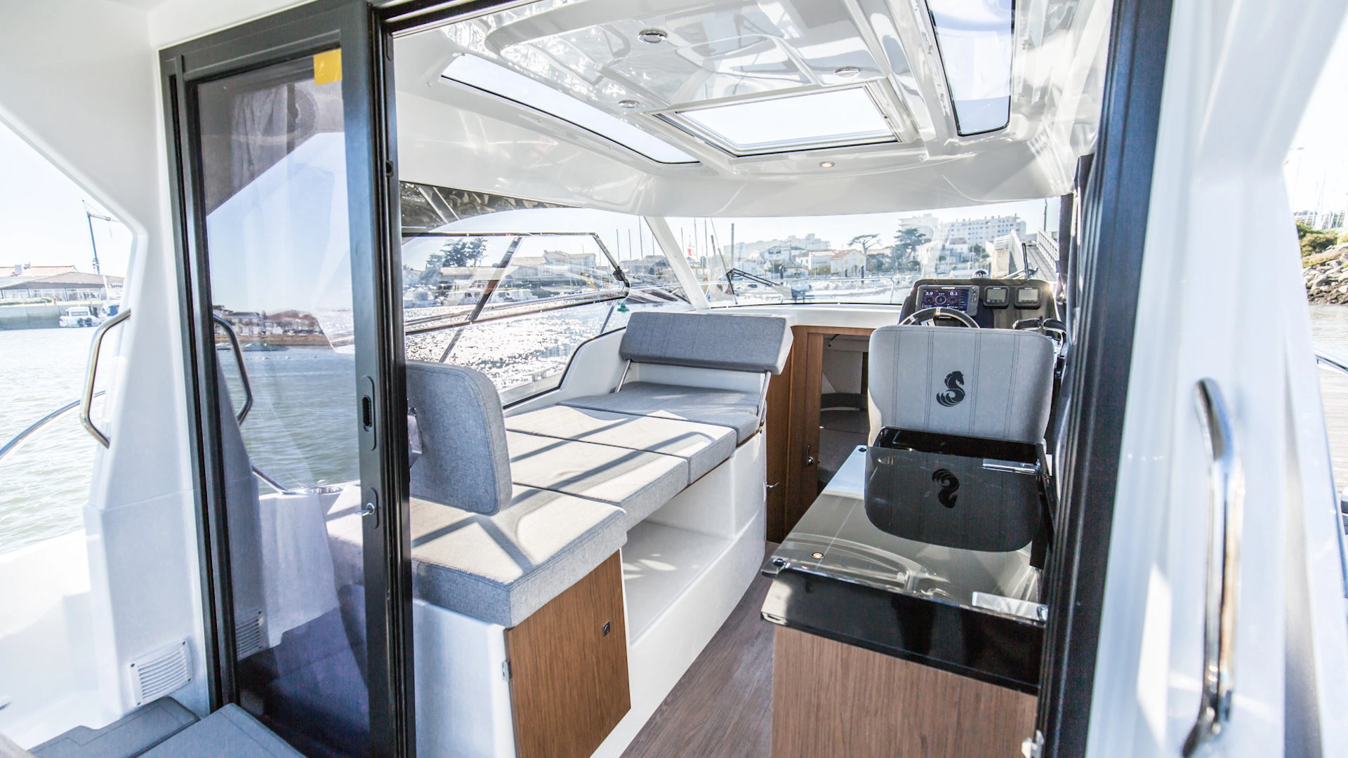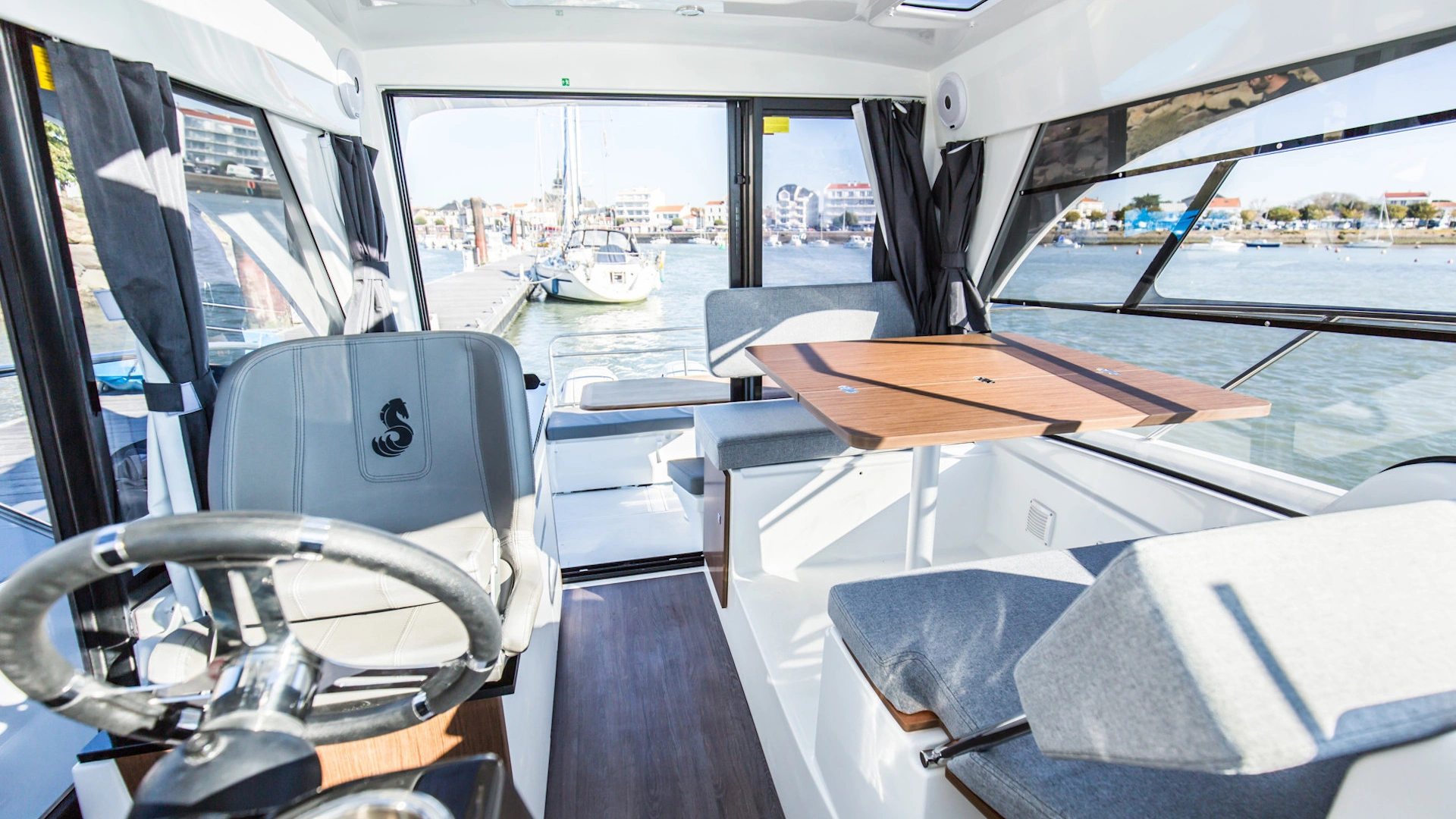 Two separate cabins, one galley and a cleverly fitted shower room make the Antares 9 the ideal boat for cruises with family and friends! With wraparound windows, the pilothouse has a panoramic view and is incredibly bright. There is a real feeling of space and the lounge is cleverly organized with a co-pilot seat that swings round. This means you can sit facing the sea or facing the chart table.