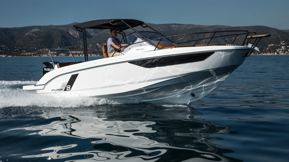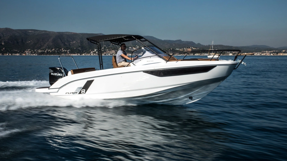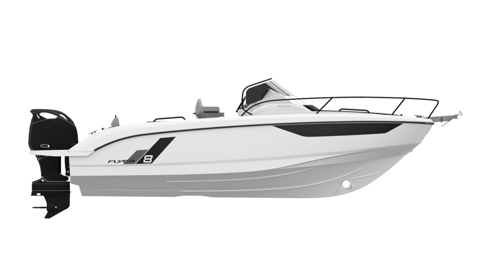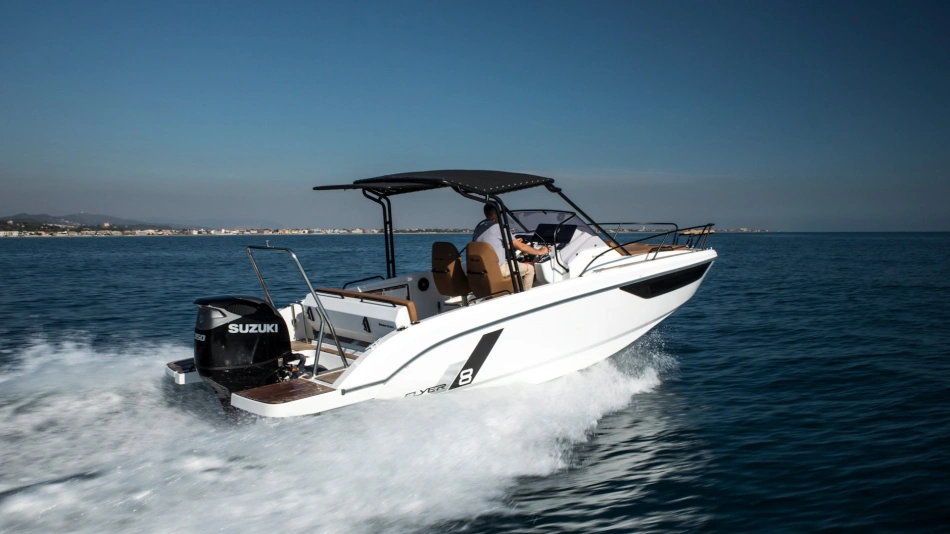 The Flyer 8 SUNdeck exceeds regular day boat standards by combining comfort, generous space and sensations. Its highly optimized design makes it the ideal boat for a weekend getaway. A decent-sized cabin lies beneath a large sunbathing area for lazing in the sun.