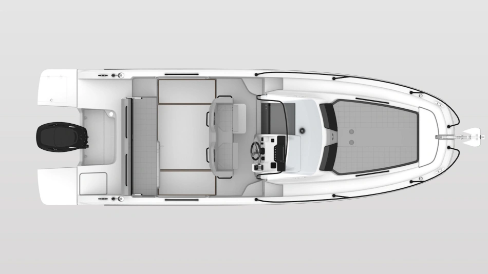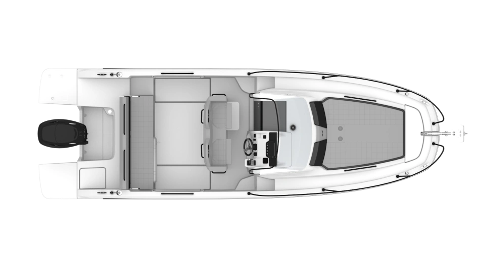 The Flyer 8 SUNdeck has the aesthetics of a modern classic, with taut yet attractive lines, complete with black pulpits. Developed on the latest generation of outboard hulls equipped with Air Step 2, the boat lifts off quickly and offers outstanding cruising comfort. The aft bench seat is easy to fold back, providing optimum cockpit space. There are also lots of ergonomic storage spaces spread throughout the boat.