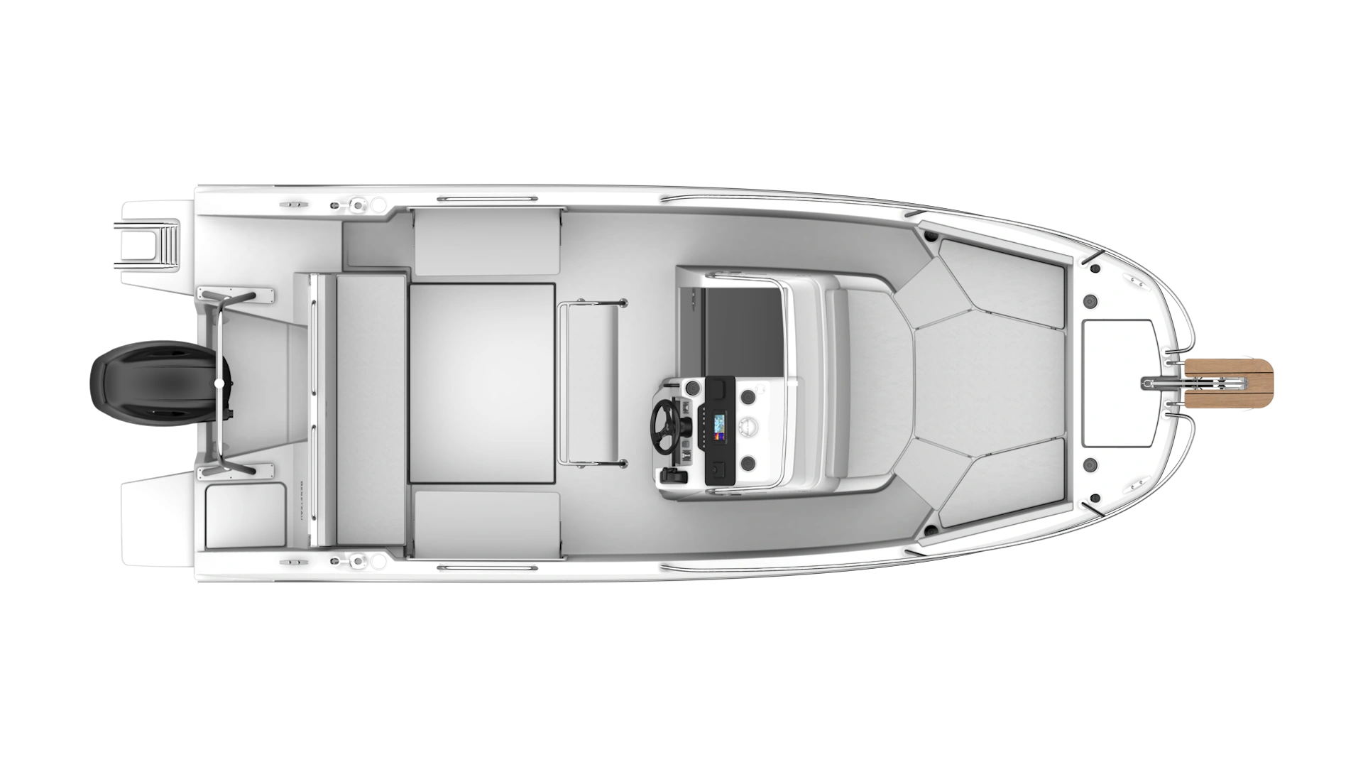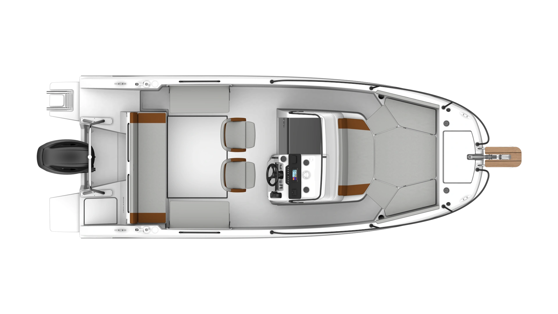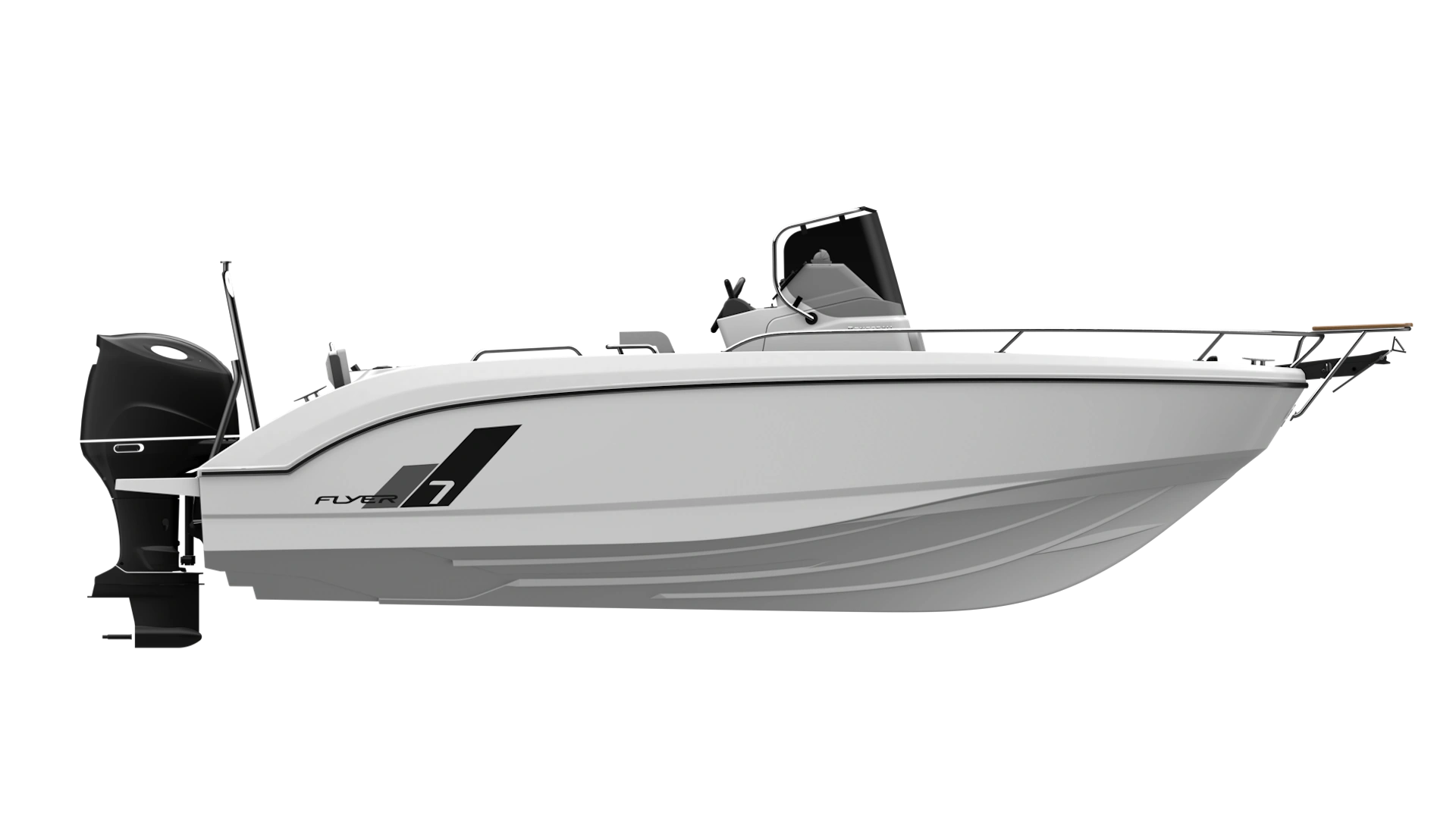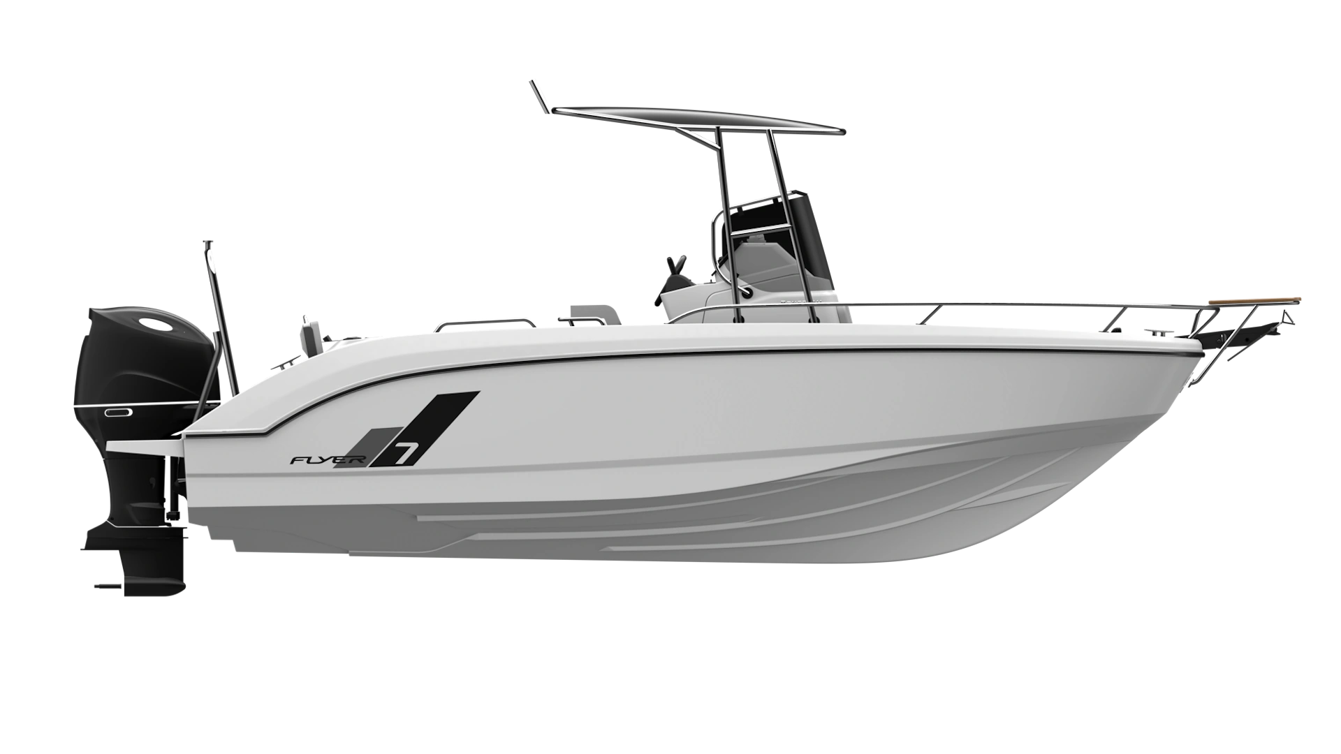 The Flyer 7 SPACEdeck is conspicuously sporty and energetic. You have a choice of two versions of upholstery: standard (with stainless steel pulpits) or Elegance (with black pulpits). The console has a wraparound windshield and hand rails which make movements on the two symmetrical side decks much safer.