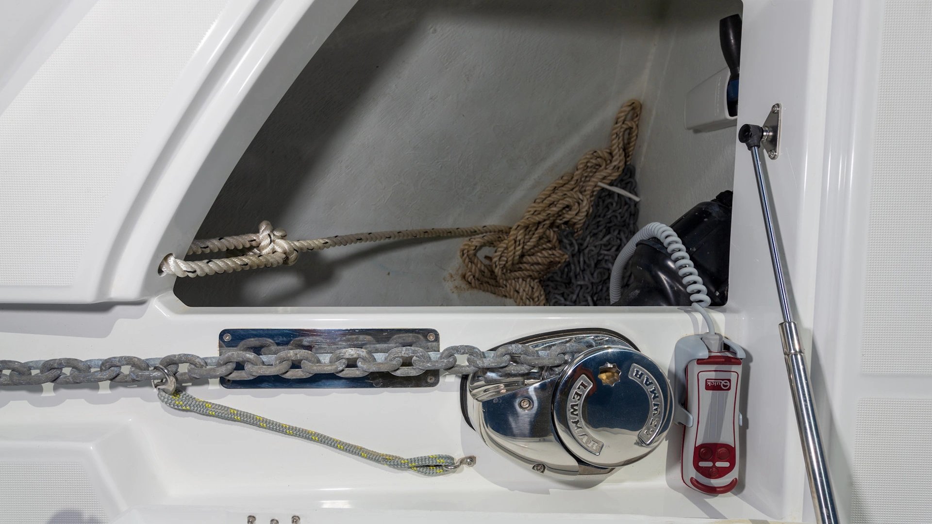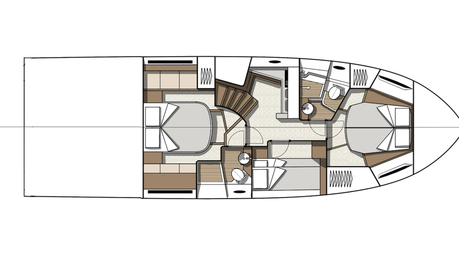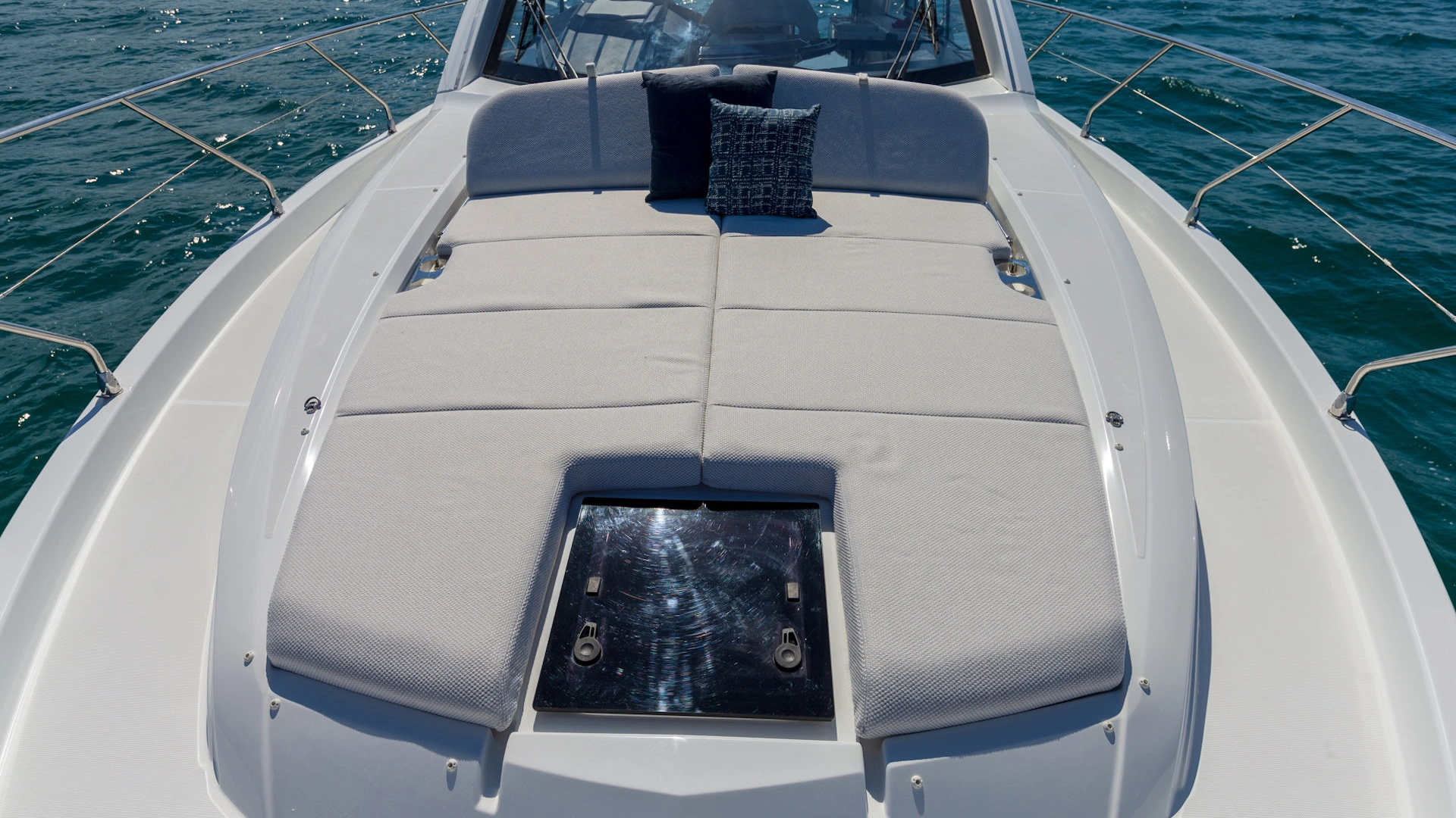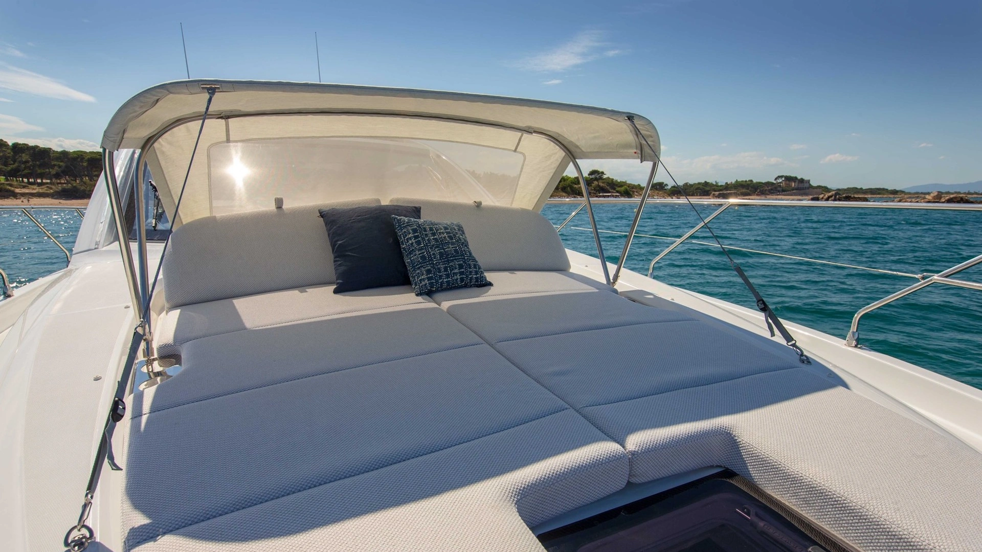 On the lower deck, all the comforts are provided to prolong the escapade at sea: a very beautiful owner's cabin at the back with its independent shower room, a guest cabin at the bow with a second shower room, a convivial saloon and a large equipped kitchen. The elegant and warm atmosphere offered by the grey walnut wood characterises the new generation of Express-Cruisers.