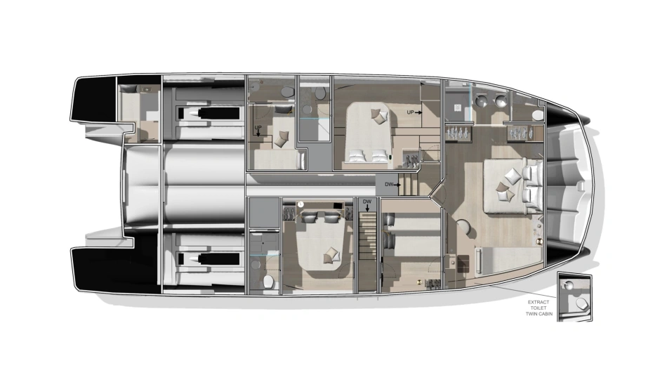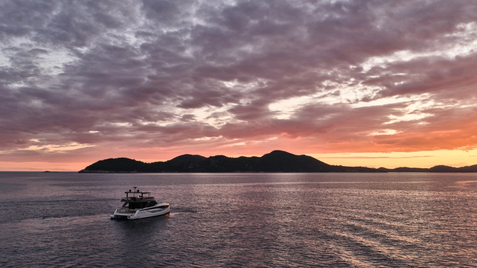 At sea or at anchor, the M7 offers a yet unimagined quality of life on board for her category. Her multihull configuration offers space and an exceptional level of fit and finish, all in perfect harmony with nature.