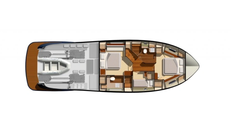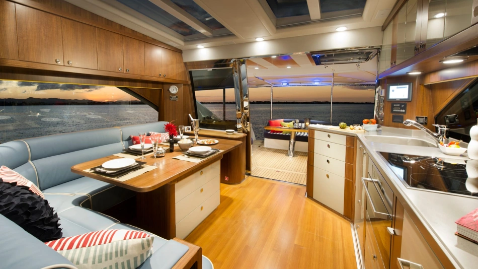The technical credentials of the Belize 54 Sedan will certainly impress. Resin-infused composite construction, double vinyl-ester outer skin, watertight, stepped collision bulkhead and independent foam-filled hull compartments. CZone digital switching system, Glass Cockpit navigation and Volvo Penta Inboard Performance