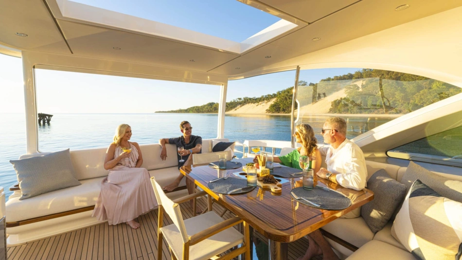 Slide open the saloon door. Then lower the electric galley window with the push of a button. Now the aft deck flows into the saloon creating one grand living and entertaining space with two designer dining areas.