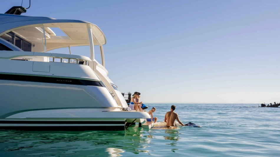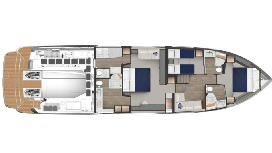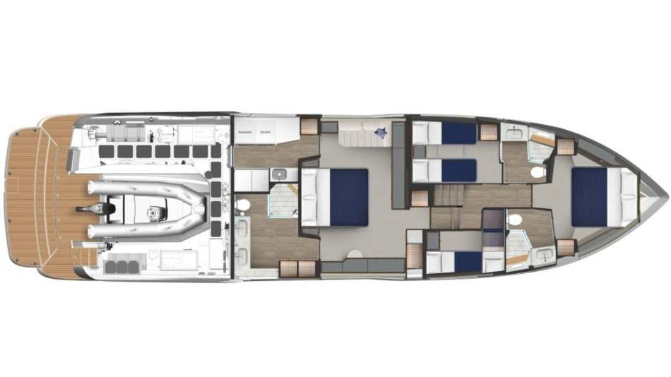 Perfect for a long-range adventure or a weekend away; with a choice of 3 or 4 staterooms and three bathrooms, a crew cabin or utility laundry, a full-height walk-through engine room and an impressive tender garage devoted to water sports.
