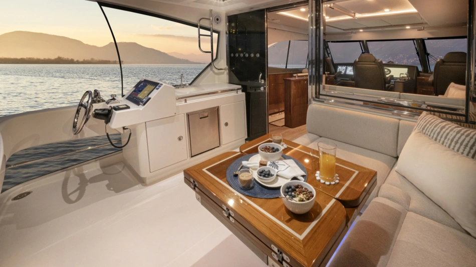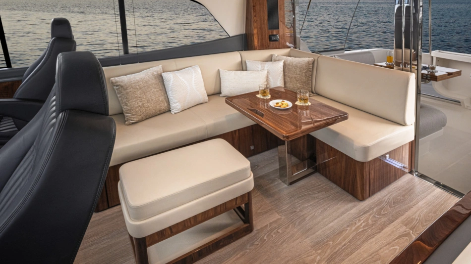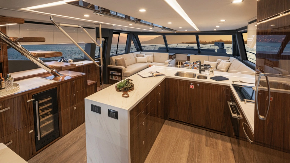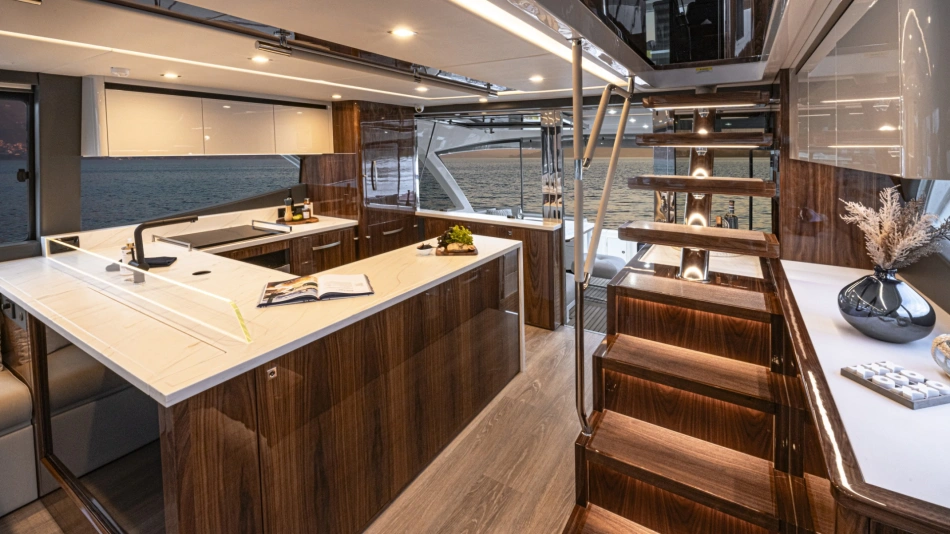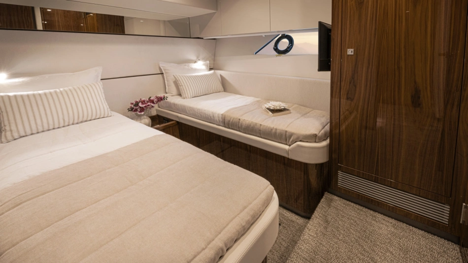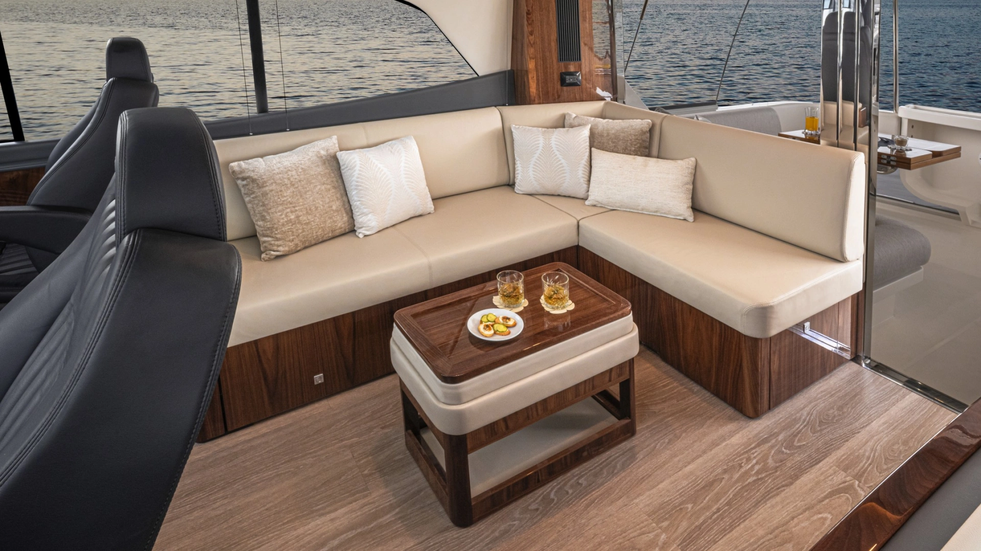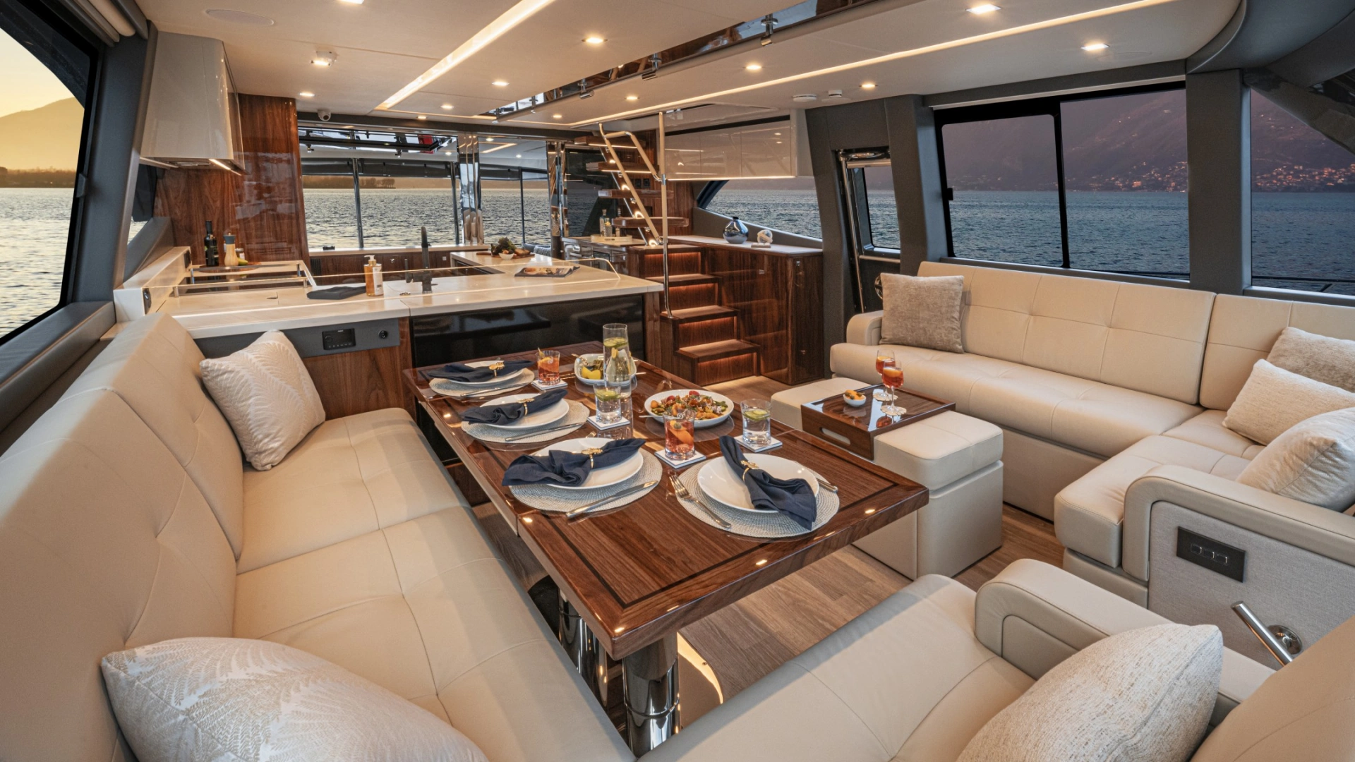 First launched in 2020, Riviera’s 64 Sports Motor Yacht set the benchmark for a 64-foot blue-water yacht that has it all; walk-around side decks, foredeck lounge and entertaining, all-weather alfresco deck, luxurious saloon with internal staircase to a fully enclosed air-conditioned flybridge and state-of-the-art helm. Magnificent accommodation included a choice of three or four staterooms, three bathrooms, an opulent full-beam master suite and versatile utility room or crew cabin. Engineering excellence matched her sports performance to ensure a smooth, quiet and efficient ride across varying speeds and a range of offshore conditions. And of course, a wide, open cockpit to allow enjoyment of all manner of water sports.