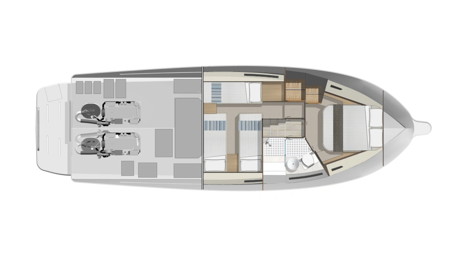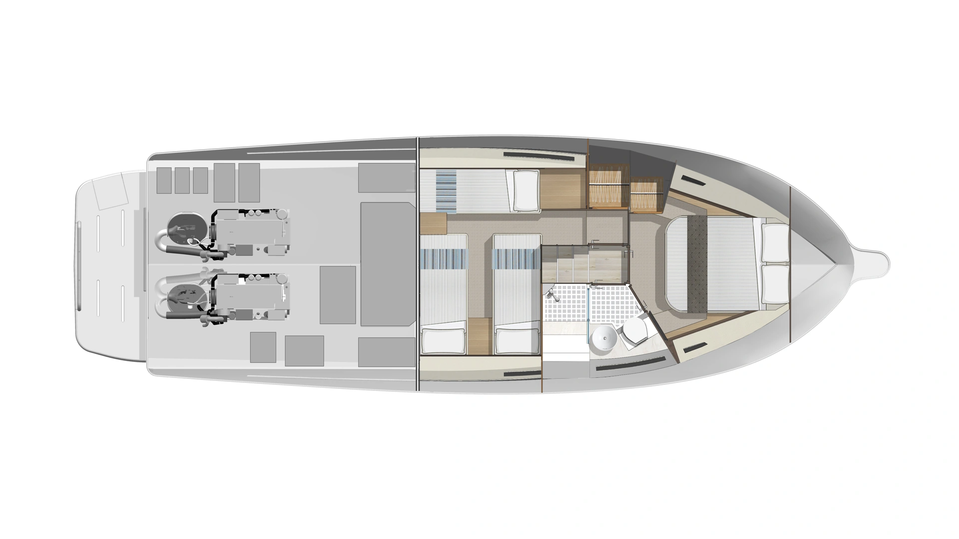 Discovering the accommodation deck you’ll quickly appreciate how Riviera design sense and flair makes so much possible. The master stateroom boasts a large walk-around queen-size bed, handcrafted storage and adjacent designer en-suite. Your guest stateroom accommodates up to three adults in signature Riviera style.