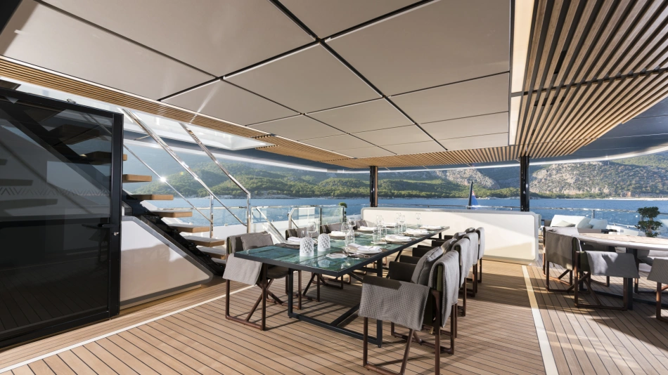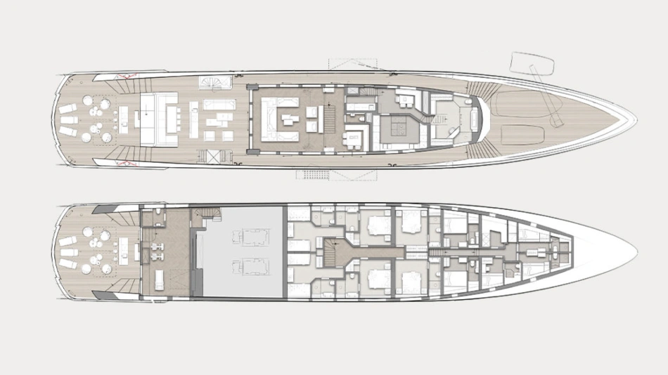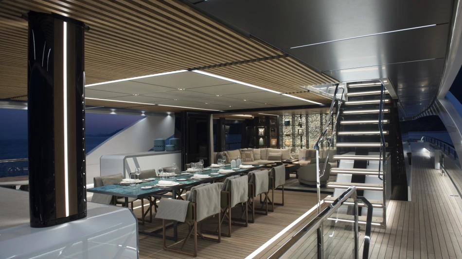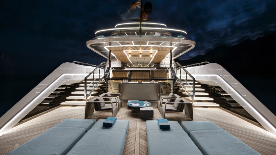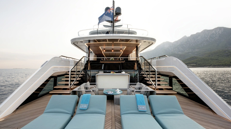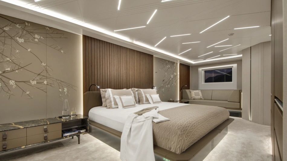 The amount of space and the flow of the layout were crucial to the owner’s enjoyment of his yacht. The yacht can sleep up to 12 guests in six staterooms – rare on a 499GT yacht – including a lavish split-level master suite on the upper deck with a private 4-metre pool on the foredeck.