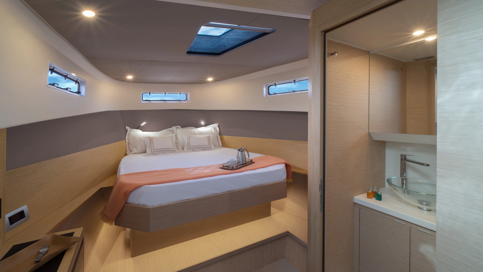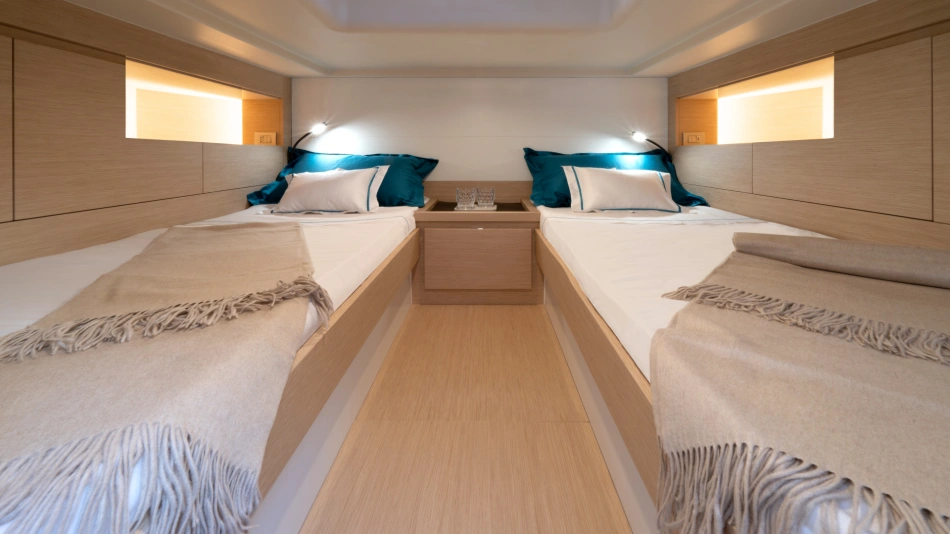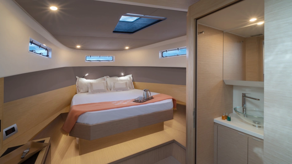 The master cabin offers impressive space and comfort, with a bed size that rivals those typically found on much larger yachts.