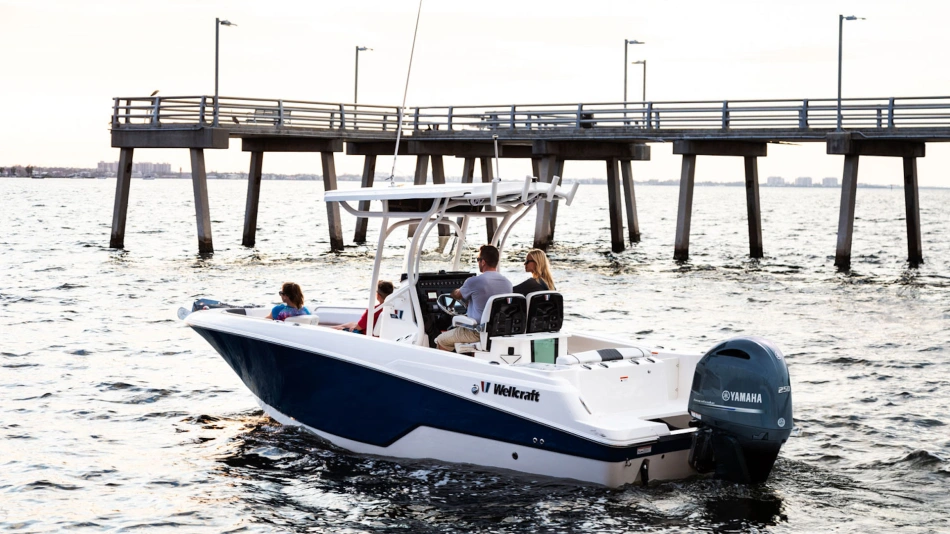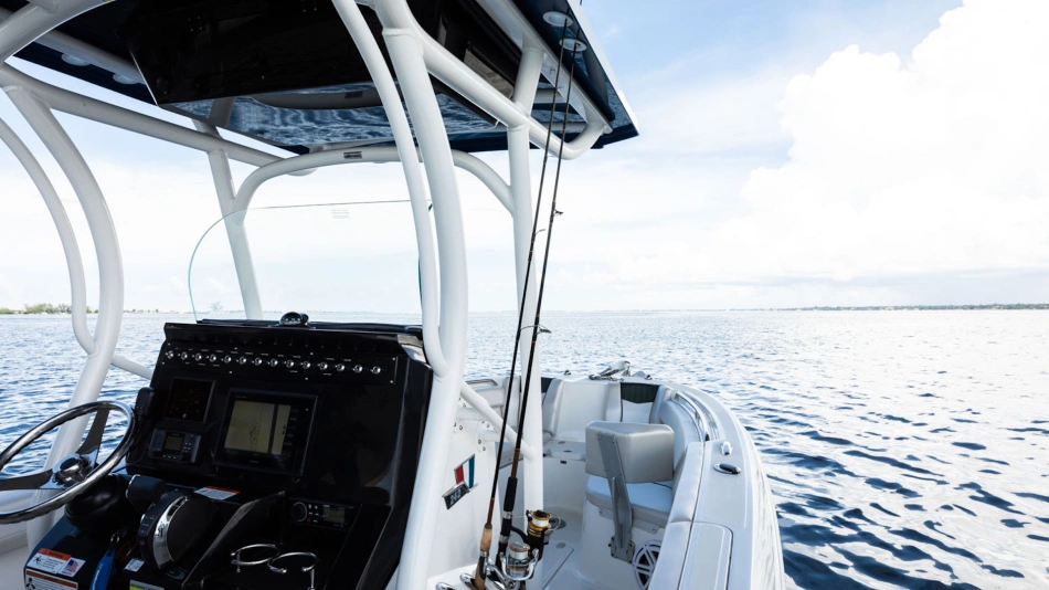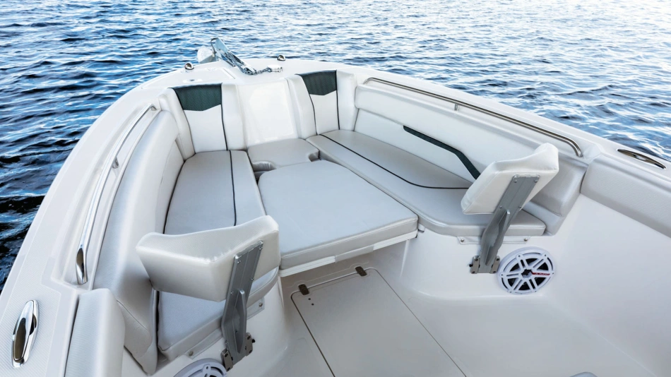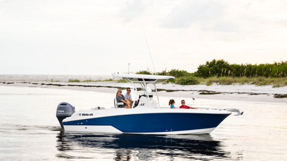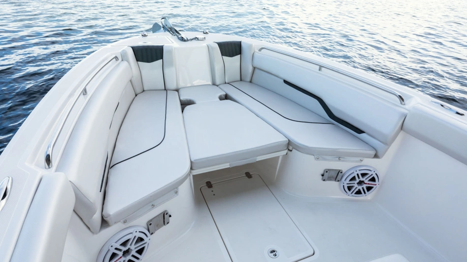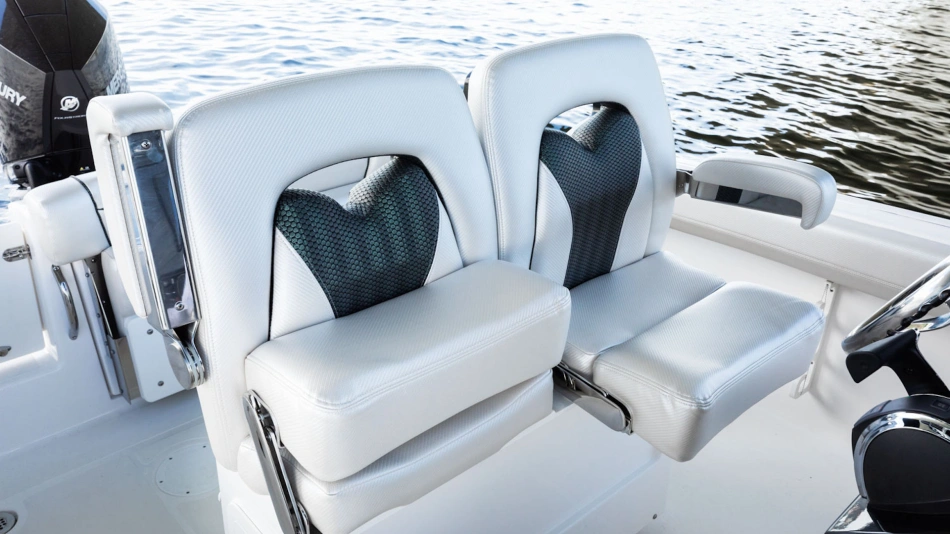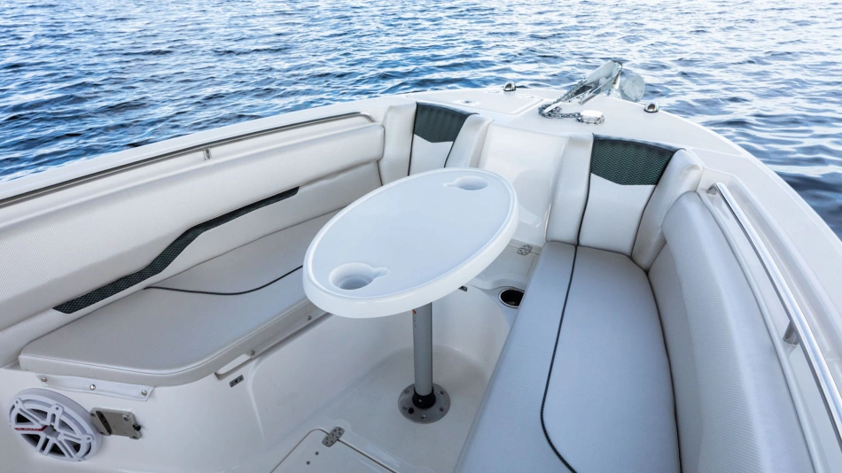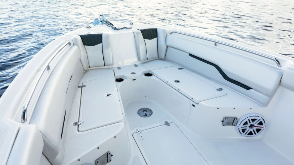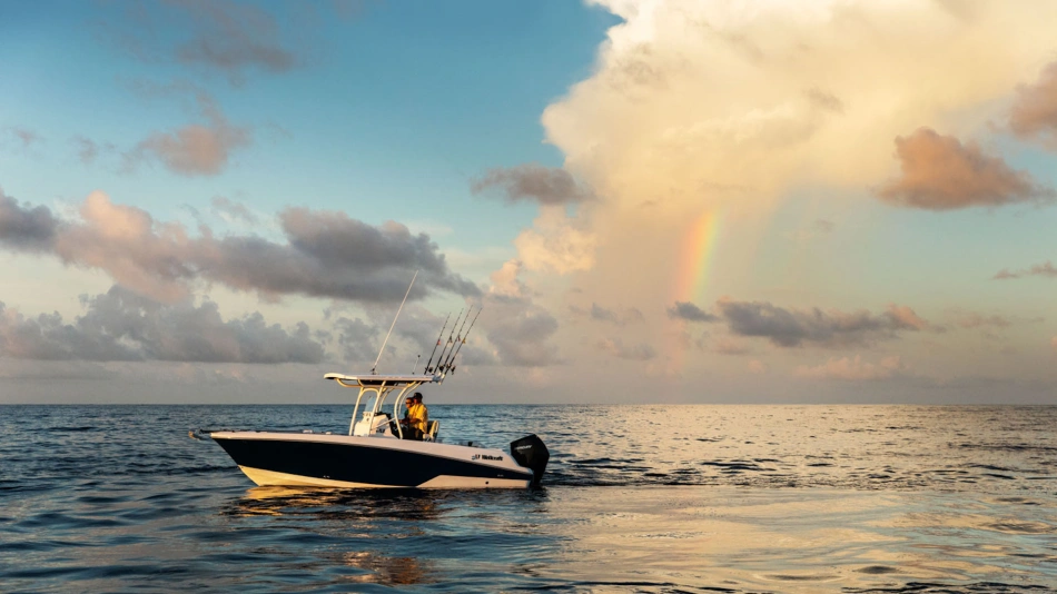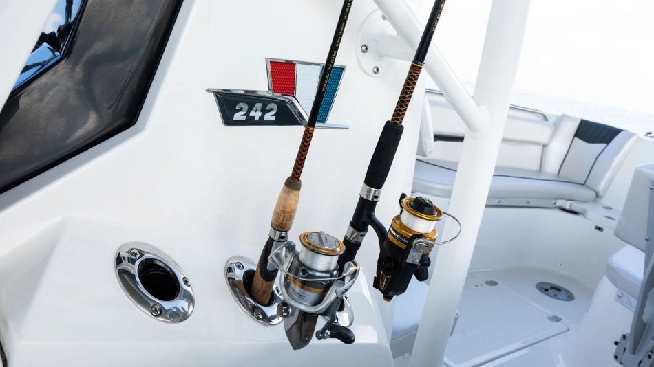Whatever your passion: luxury fishing, family boating, or offshore cruising, the 242F embraces it all. Powered by single or dual applications, this 24'4" vessel delivers the length and muscle fishermen need when heading offshore—a textbook ride only possible through a high freeboard, deep hull, and an articulated bow flare.