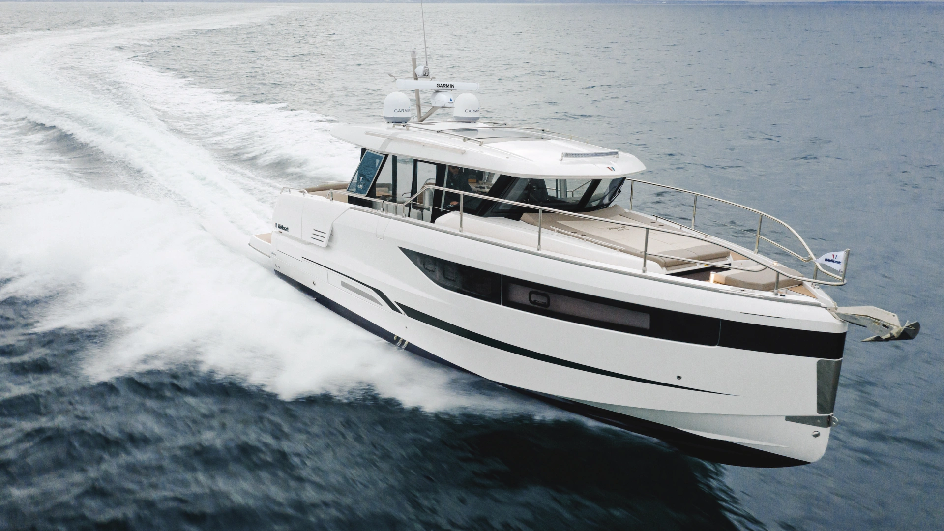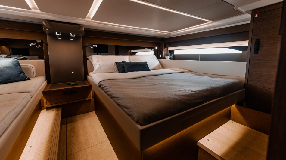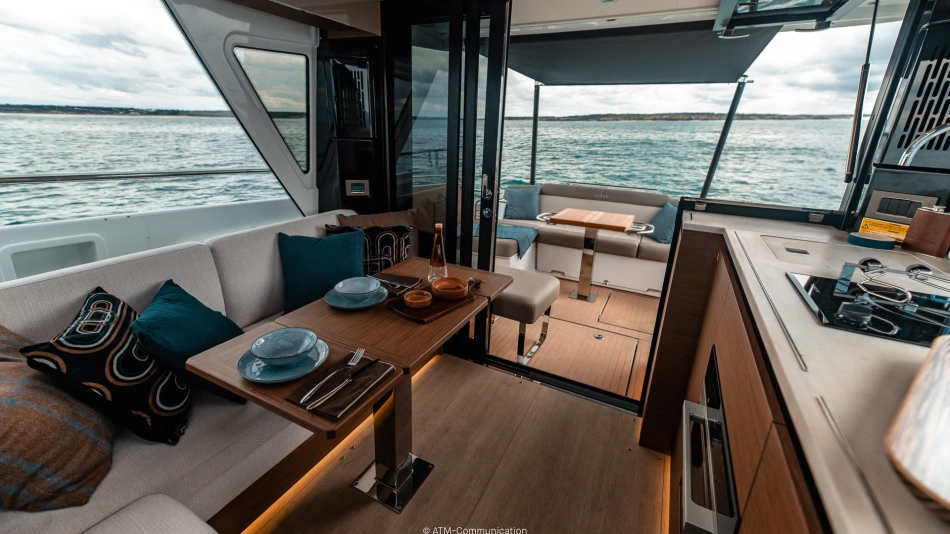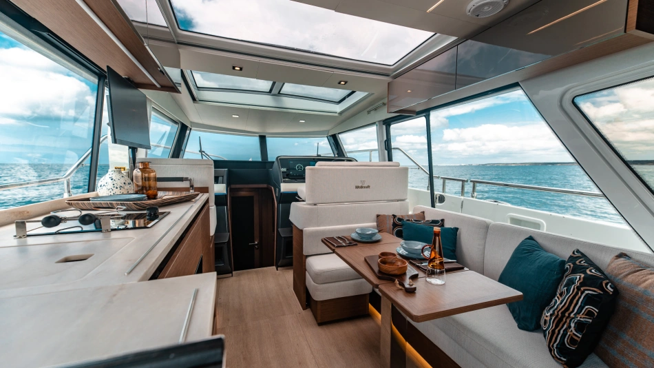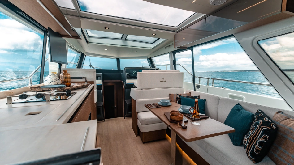 The Wellcraft 44 Explorer is designed to provide the ultimate in comfort and convenience. The high freeboard and starboard side door make life onboard easy and safe. The bow features two (2) large social areas with a generous triple sun lounger and seating designed for entertaining, while the aft provides two (2) comfortable lateral folding side terraces for a spacious open-air gathering area.