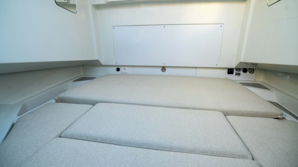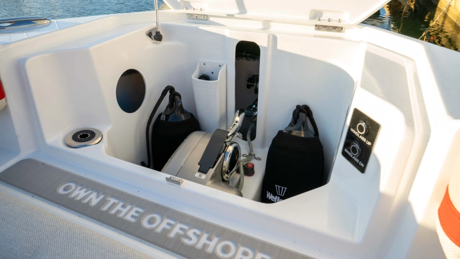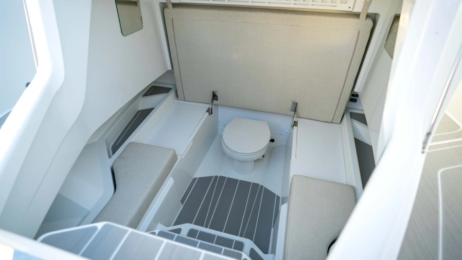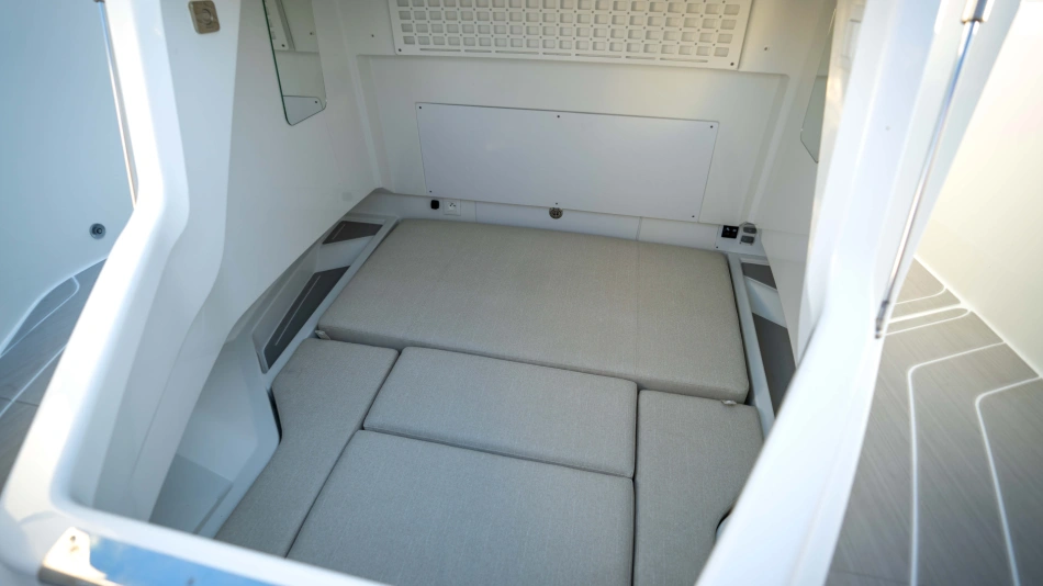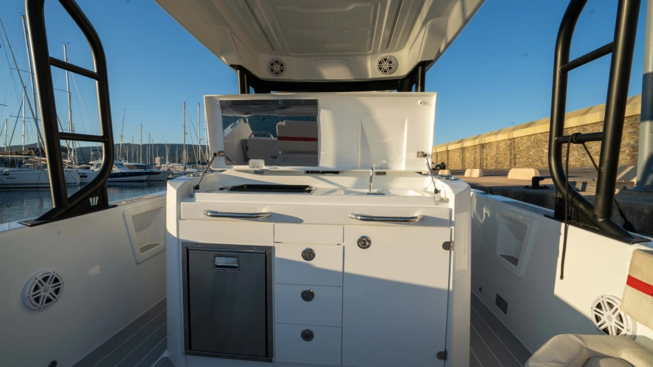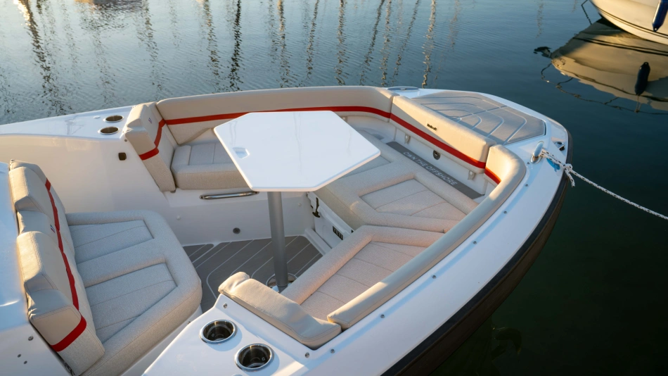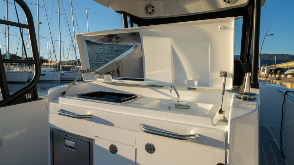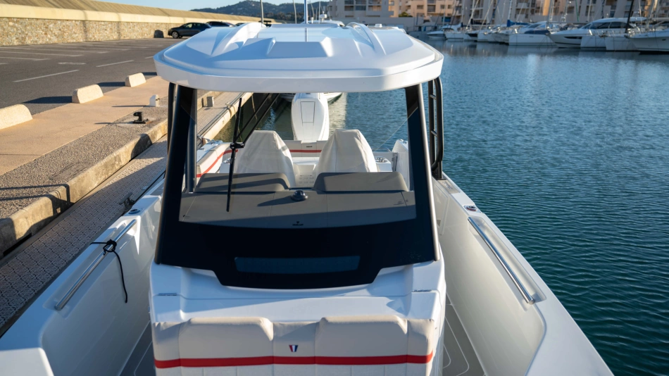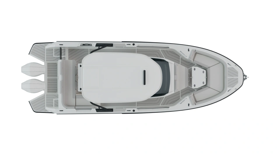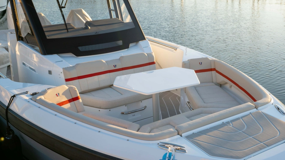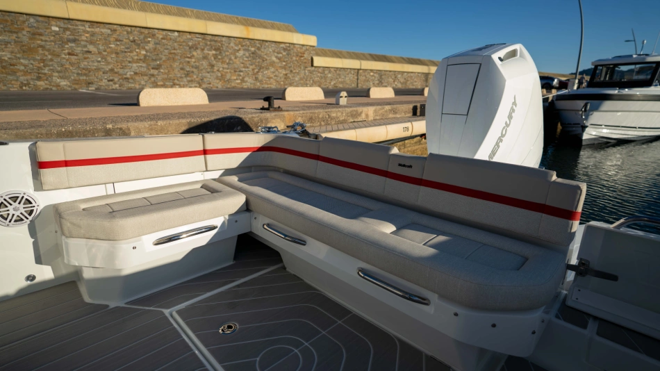 Opt for the High windshield for maximum protection or the Sport windshield for a more open, driving pleasure vibe. Aft, choose the layout that fits your adventures: Lounge (social, up to 13 seats), Barracuda (fishing ready), or Relax (full sunbed).