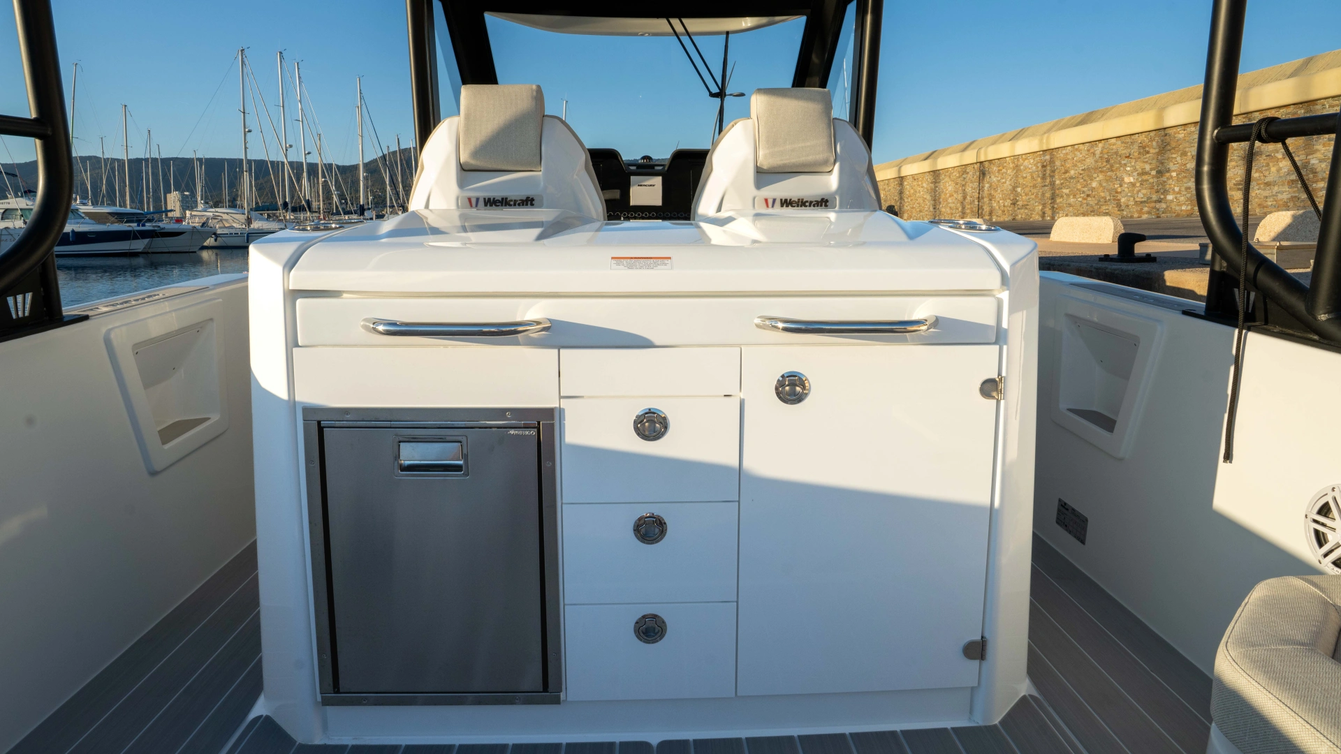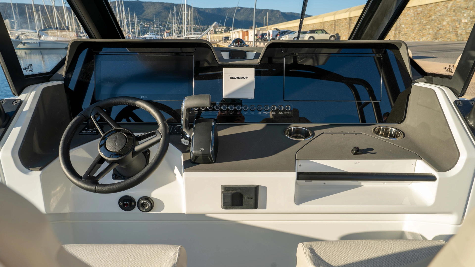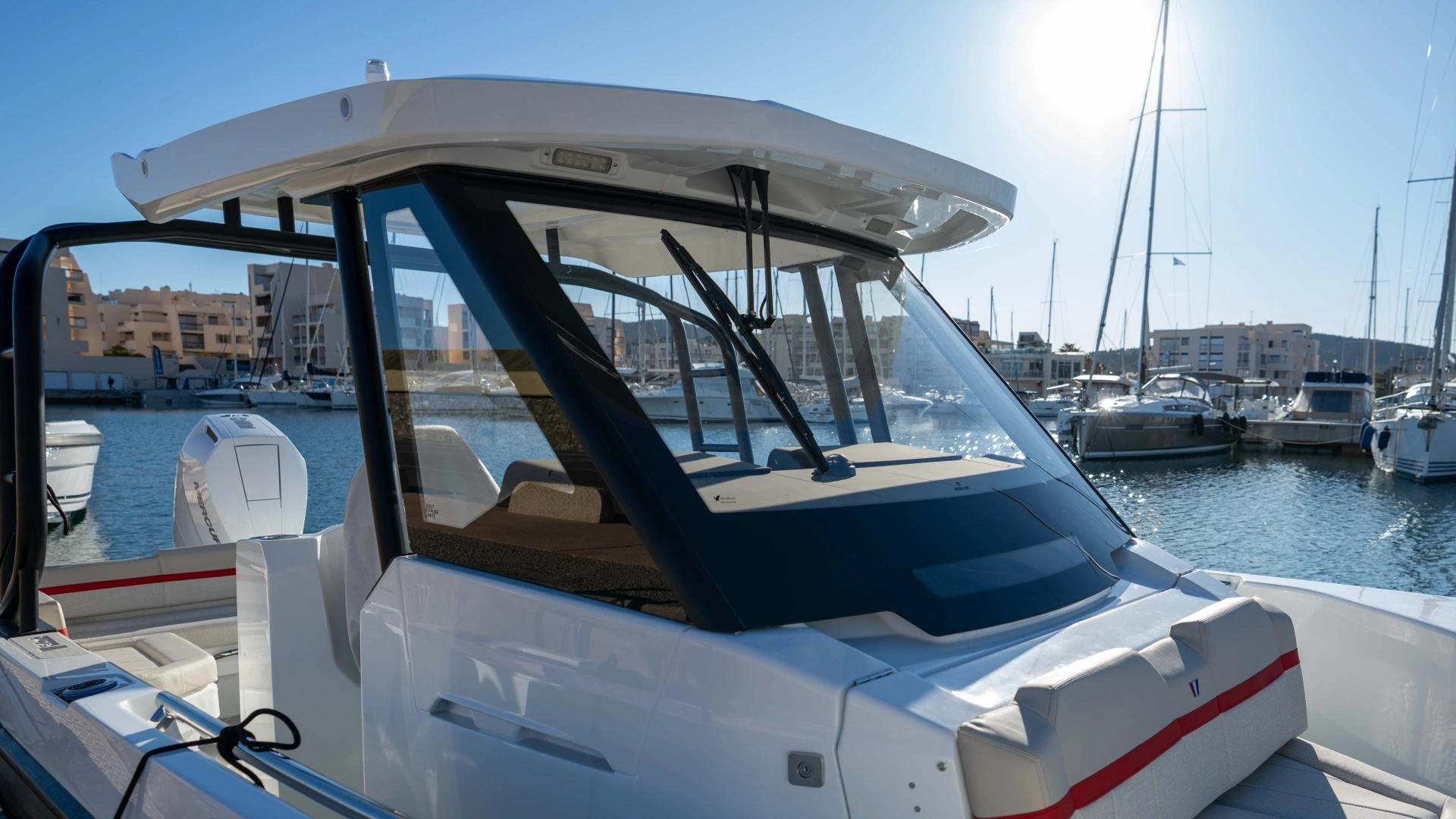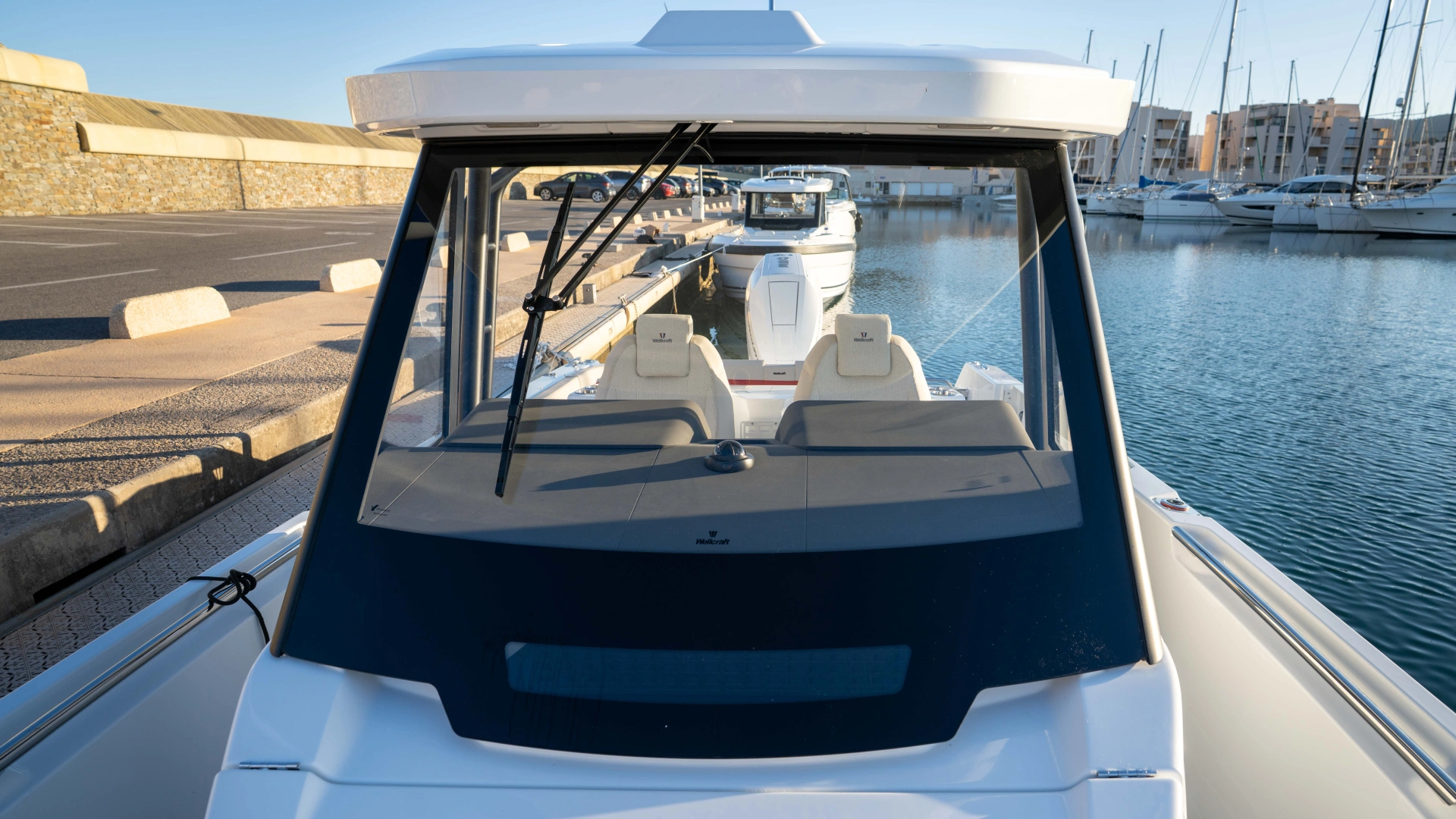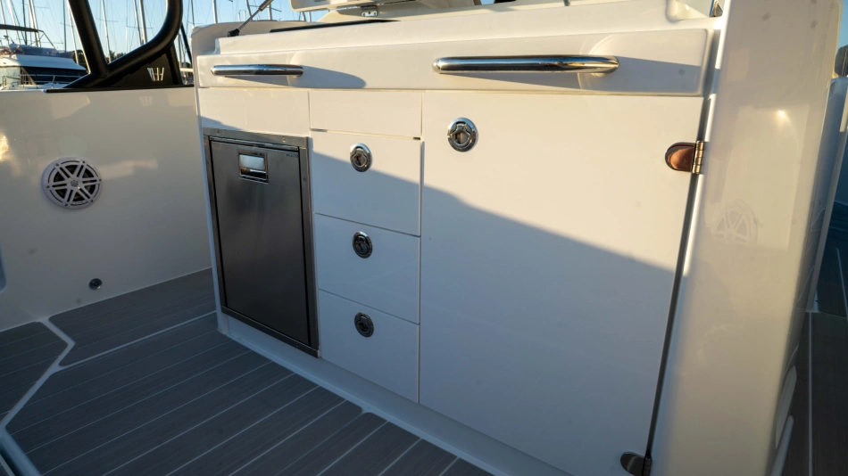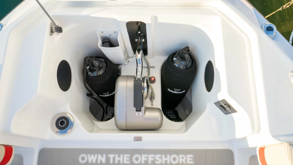 Opt for the High windshield for maximum protection or the Sport windshield for a more open, driving pleasure vibe. Aft, choose the layout that fits your adventures: Lounge (social, up to 13 seats), Barracuda (fishing ready), or Relax (full sunbed).